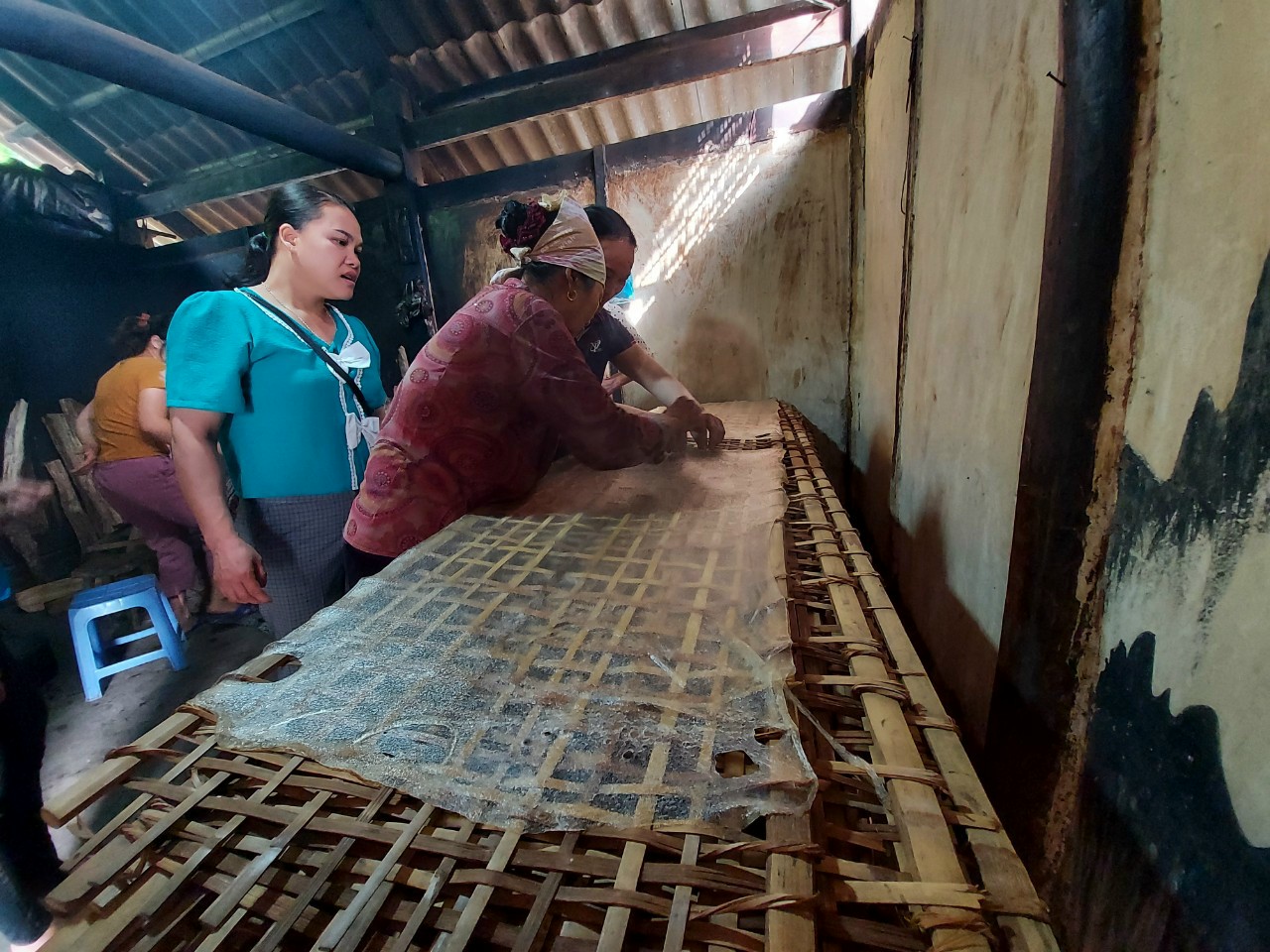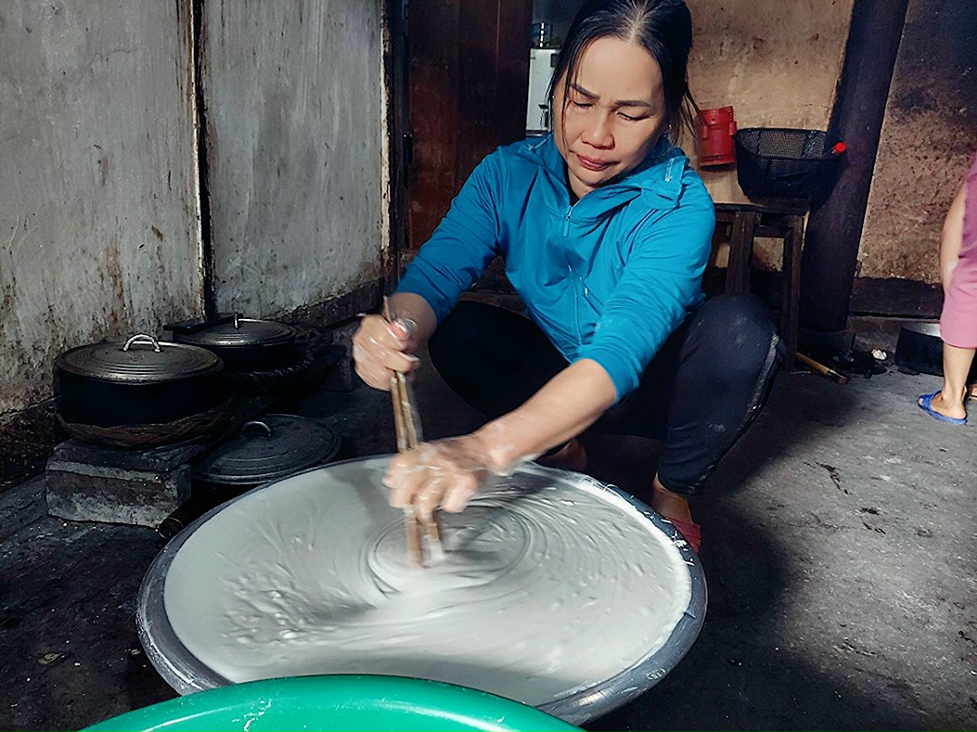 | 15 | Phối chế nguyên liệu công đoạn 3 - Sau khoảng 02phút, bột chín đều thì lấy một cái que dài khéo léo cuộn bánh trải nhẹ ra phên rồi mang phơi. |