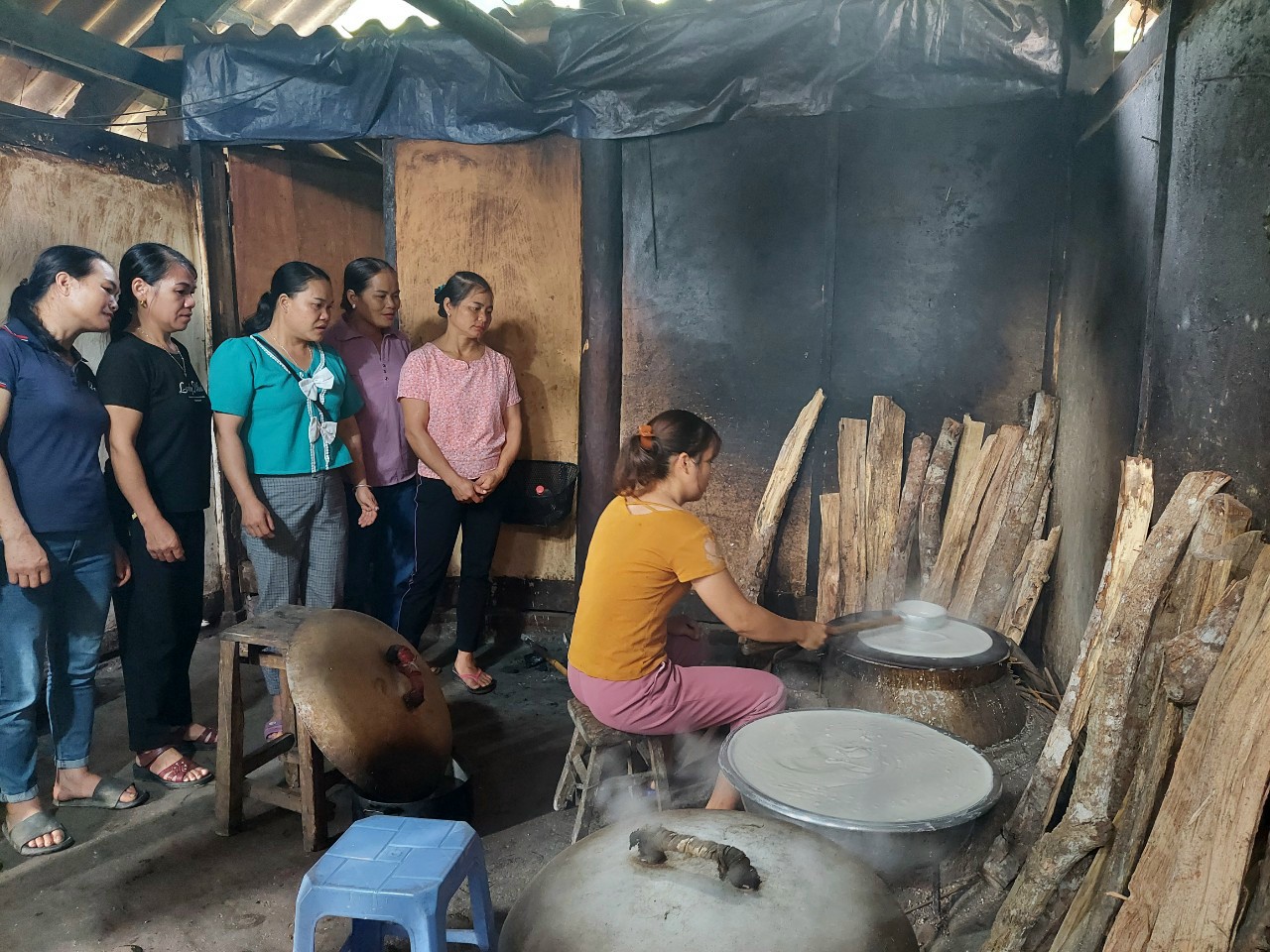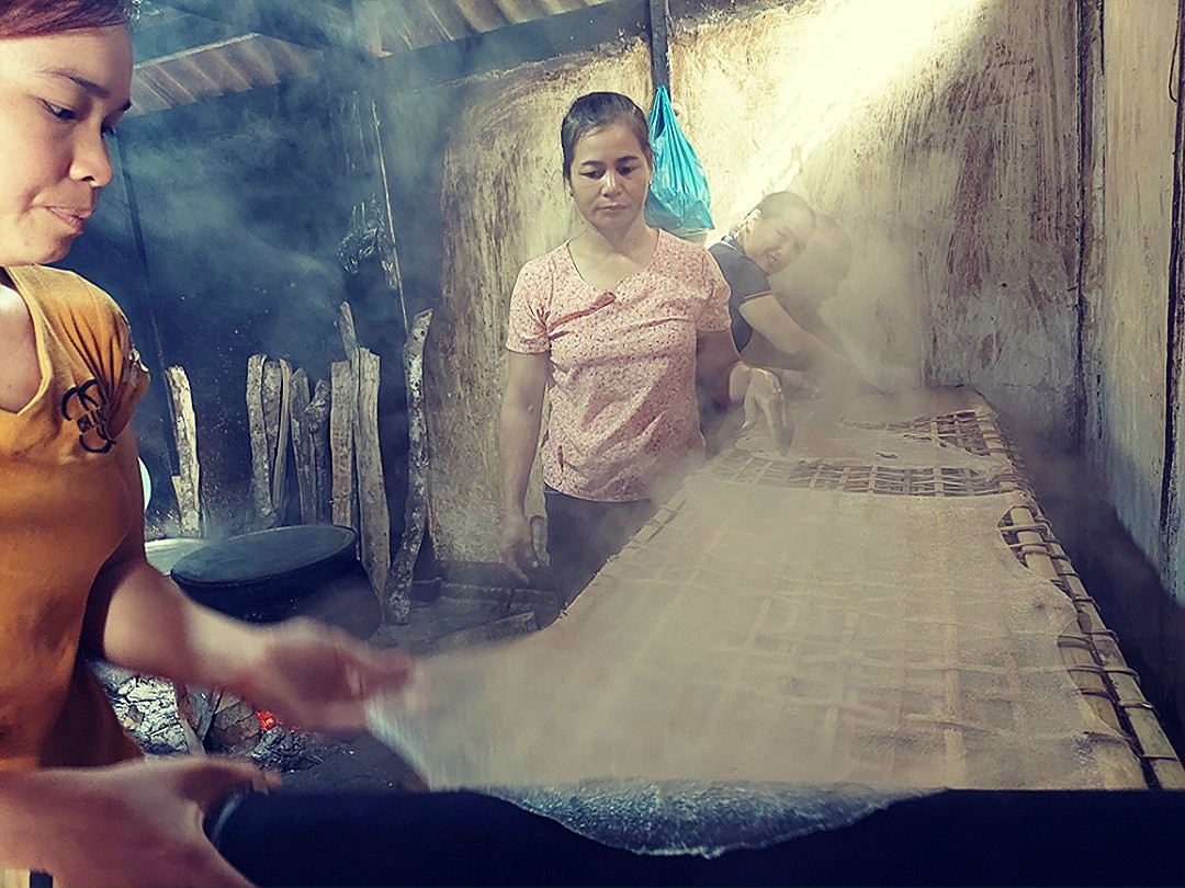 | 14 | Phối chế nguyên liệu công đoạn 3 - Tráng miến: Công đoạn này cần chuẩn bị sẵn một chiếc nồi hoặc chảo sâu lòng khá lớn có đường kính 50 – 60 cm và rất nhiều củi khô đã được đi lấy trên rừng hàng tháng trước để tráng miến. Khi tráng miến thì đổ nước vào nồi sao cho nước chiếm 2/3 nồi. Trên miệng nồi đặt một tấm phên đan dày rộng hơn miệng nồi khoảng 02cm. Người ta dải thêm một tấm vải màn phủ kín tấm phên. Trước đó, phải hoà bột với nước đựng trong chum: cứ 01kg bột khô hoà được 20 – 25kg bột ướt. Bắt đầu việc tráng miến thì đun nước thật sôi. Khi hơi nước bốc lên, người ta dùng gáo múc bột đổ lên dàn mỏng trên tấm màn rồi đậy nắp lên |