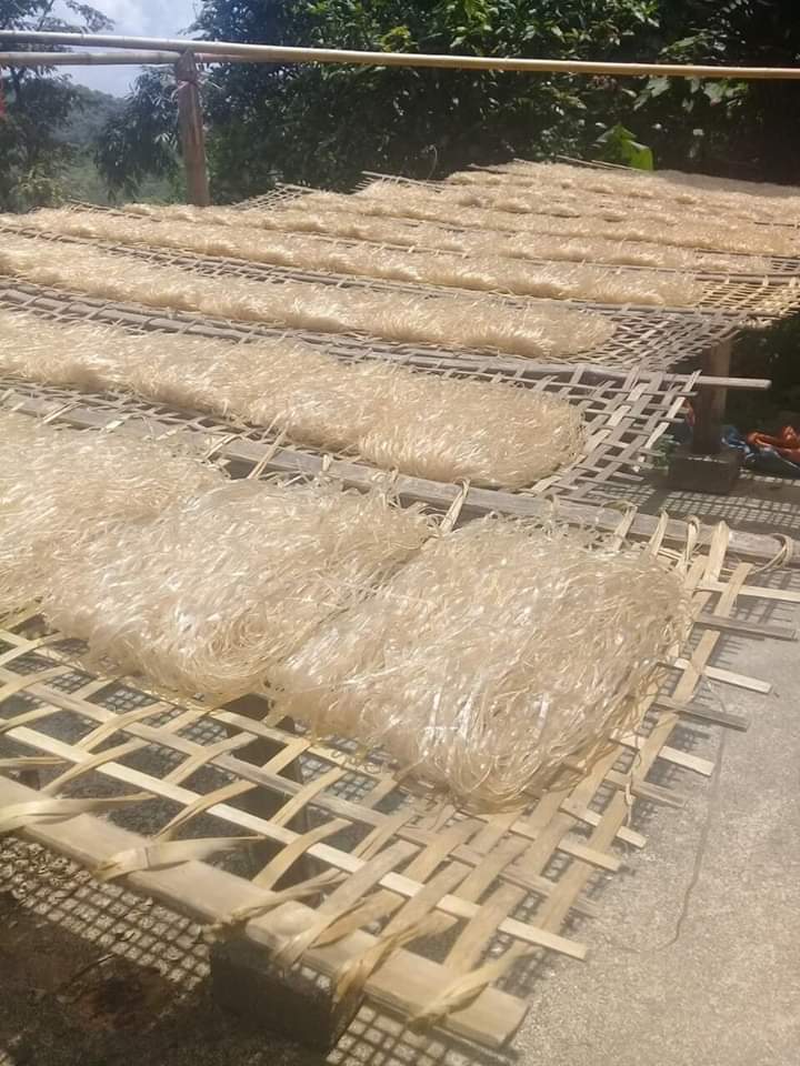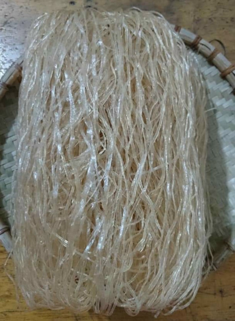 | 16 | Phối chế nguyên liệu công đoạn 3 - Phơi miến: Người dân làm những dàn phơi miến ở những nơi đón được nhiều nắng. Trong quá trình phơi phải năng dở cho miến mau khô. Dàn phơi được dựng bằng 10 – 15 cây tre dài 07m – 08m gác lên các chân trụ. Theo kinh nghiệm của người dân, khi bánh khô vừa tới (bánh còn ẩm) thì xếp bánh chồng lên nhau cho vào túi ủ qua một đêm rồi mang ra cắt. Không có máy cắt miến, người dân thường thái thành những sợi nhỏ 0,2mm bằng dao được mài sắc. Cắt xong, người ta sẽ cuộn hai đầu bánh vào trong và đem trải ra phên phơi cho khô. Trung bình, mỗi phên chứa khoảng 05 cuộn miến. Cho đến khi miến khô song vẫn có độ dai và không bị đứt. |