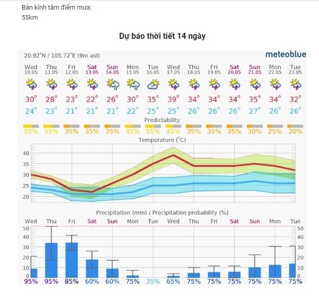 | 7 | Thao tác kỹ thuật - Dự báo thời tiết 7 ngày tới, từ đêm thứ 5 (11/5) đến hết Chủ nhật (14/5) do ảnh hưởng gió đông bắc trời trờ mát, nhiệt độ 20-24 độ, có mưa rào, mưa dông rải rác, cảnh giác gió lốc, mưa đá, đến 13/5, từ 15/5 trời nắng nóng lên 40 độ, chủ ý tưới nước, chăm sóc hoa màu, sau 18/5 trời mát, có mưa, khả năng mưa 70%. |