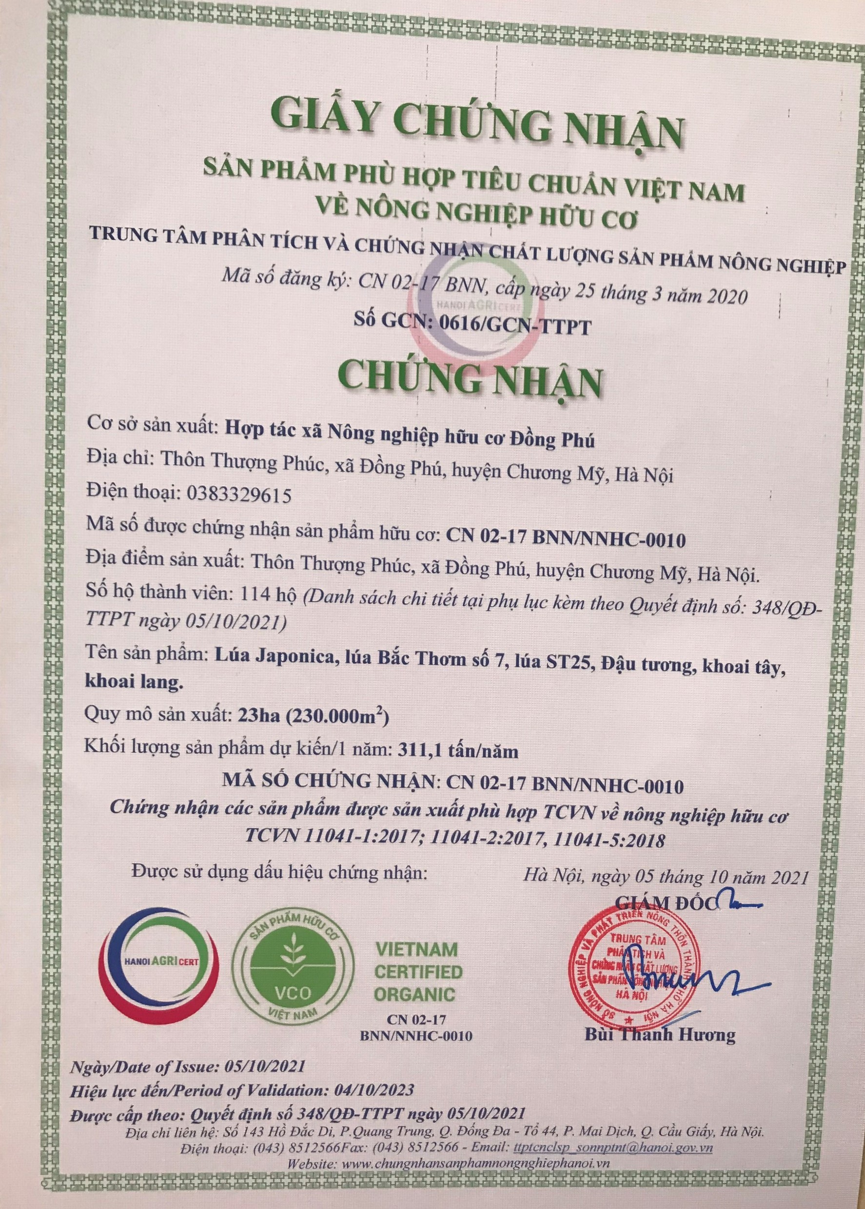 | 1 | Chứng chận tiêu chuẩn - Giấy chứng nhận Hữu cơ, OCOP 4 sao |