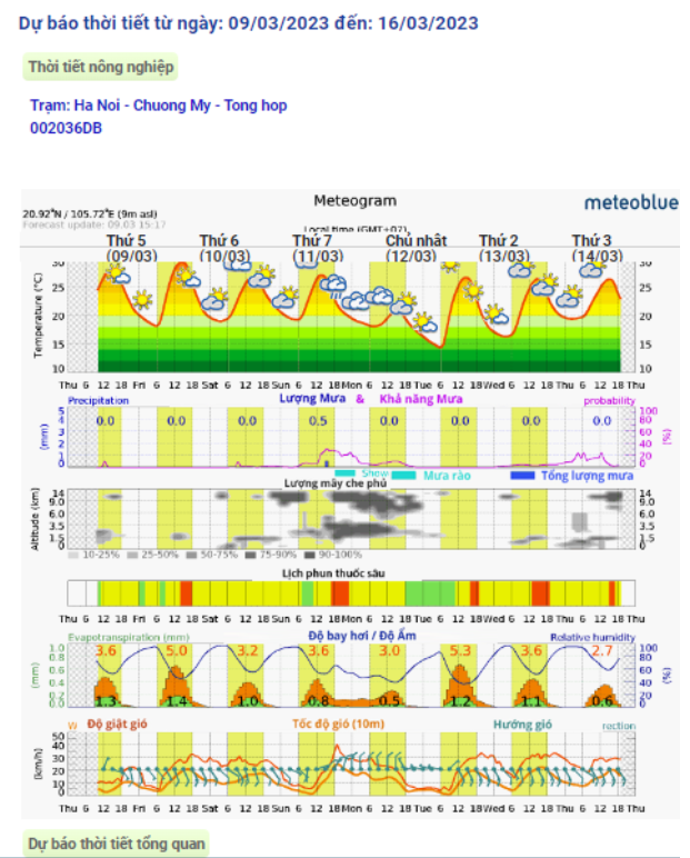 | 8 | Thao tác kỹ thuật - Dự báo thời tiết 7 và 14 ngày từ 09/03/2023, thời tiết thời tiết dịu mát, có mưa nhỏ ngày 12/03/2023, sau không mưa, chú ý tưới giữ đủ nước cho lúa non, phòng trừ cỏ dại, ốc bươu vàng |