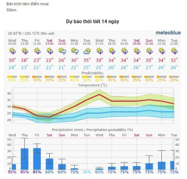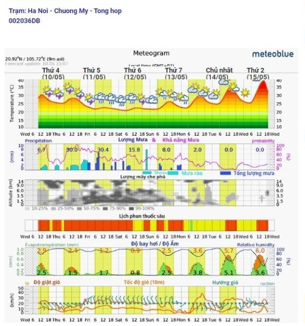 | 10 | Thao tác kỹ thuật - Dự báo thời tiết 7 ngày tới, từ đêm thứ 5 (11/5) đến hết Chủ nhật (14/5) do ảnh hưởng gió đông bắc trời trờ mát, nhiệt độ 20-24 độ, có mưa rào, mưa dông rải rác, cảnh giác gió lốc, mưa đá, đến 13/5, từ 15/5 trời nắng nóng lên 40 độ, chủ ý tưới nước, chăm sóc hoa màu, sau 18/5 trời mát, có mưa, khả năng mưa 70%. |