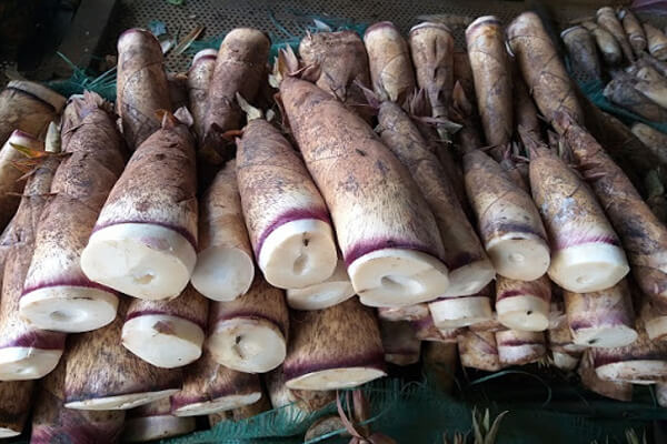 - Sau khi thu hoạch măng về, đem rửa măng thật sạch để cây măng không còn bám đất. Rửa xong, nhẹ nhàng dùng dao tách toàn bộ lớp áo măng ra khỏi thân măng. Tách áo măng xong, bạn dùng dao cắt bỏ phần gốc măng già, chỉ giữ lại ngọn măng non. Làm tới đâu, bạn cho luôn ngọn măng vào ngâm trong chậu nước muối pha loãng tới đó để măng ra bớt nhựa, chất độc có trong măng.