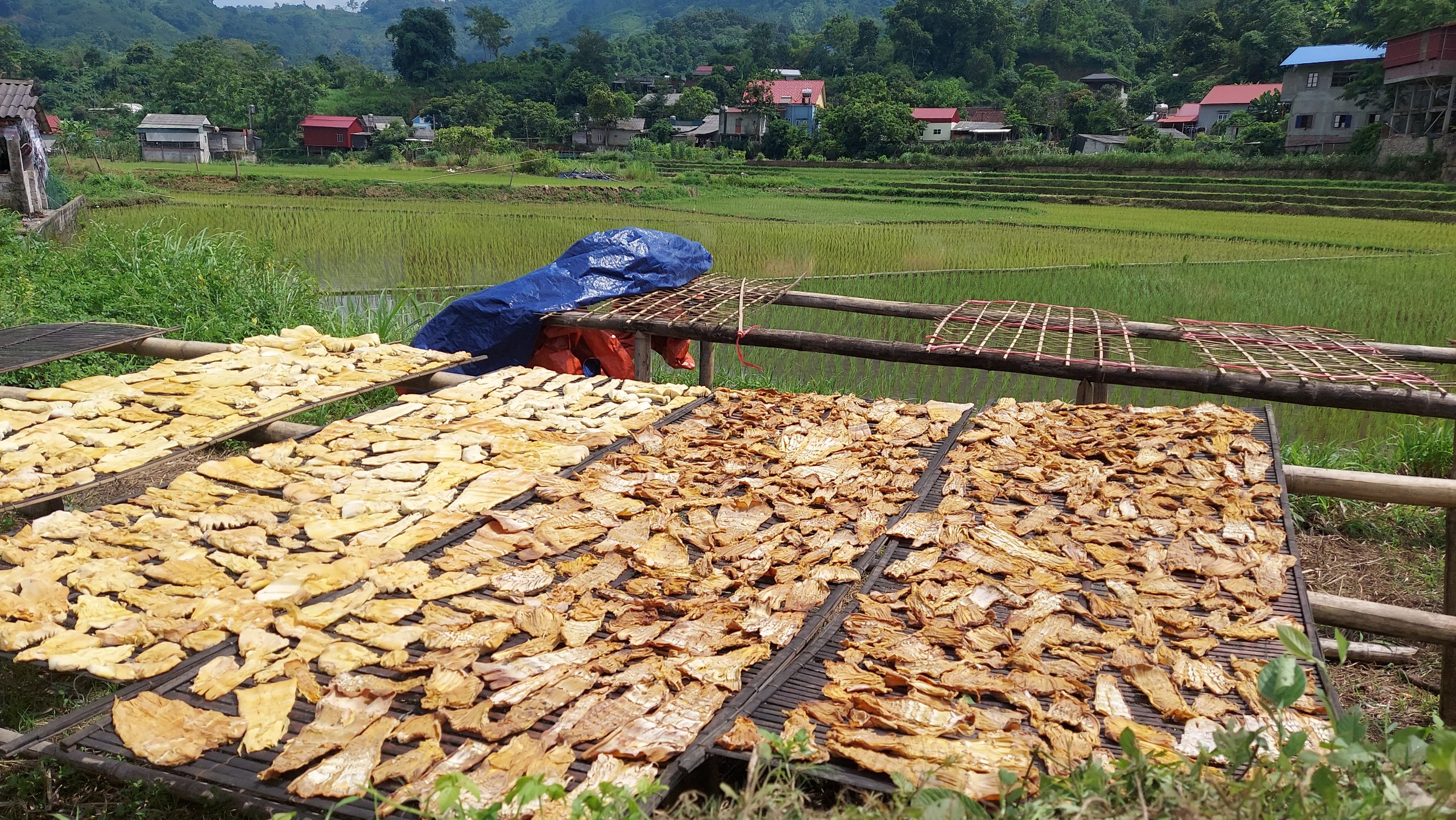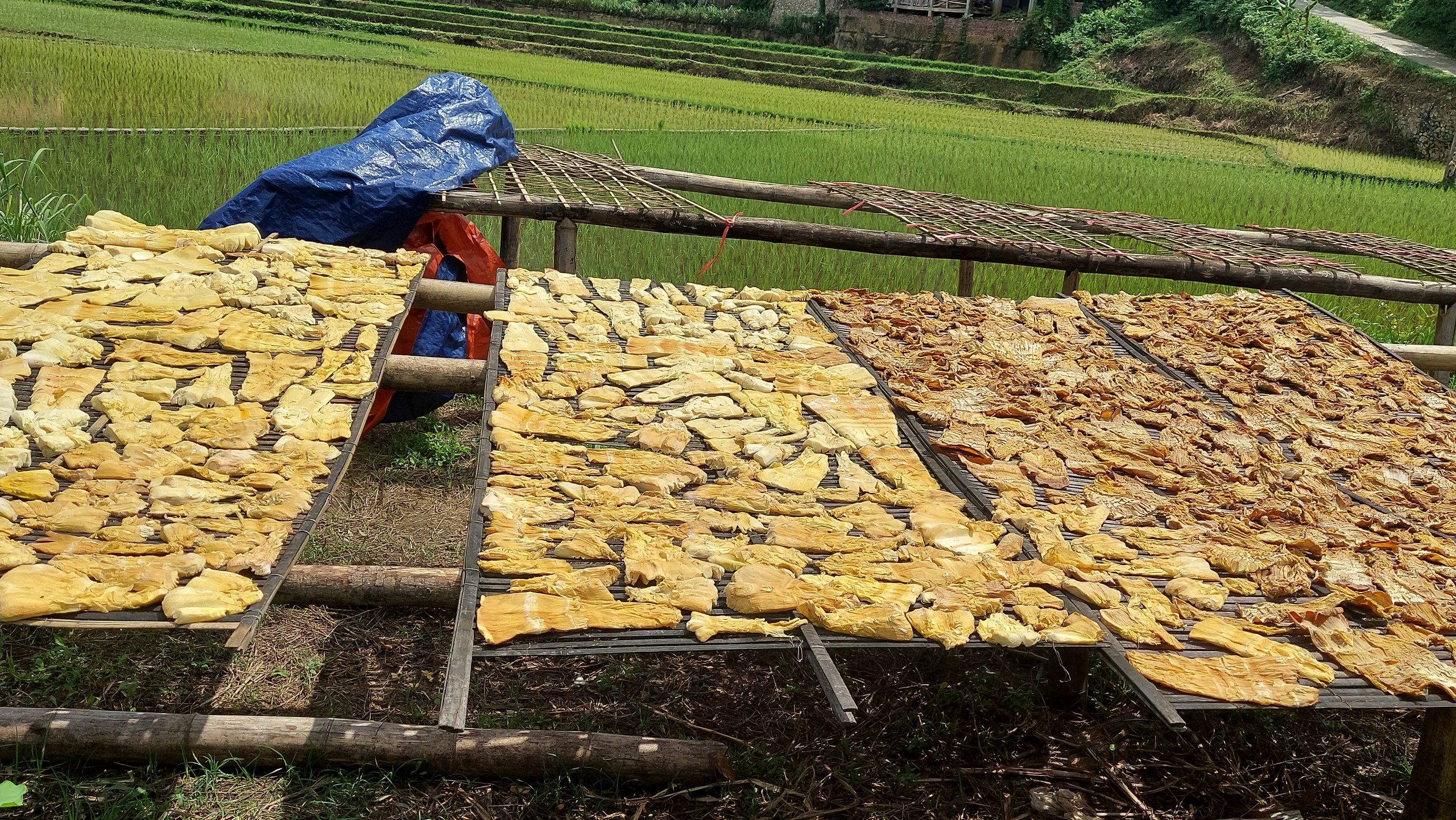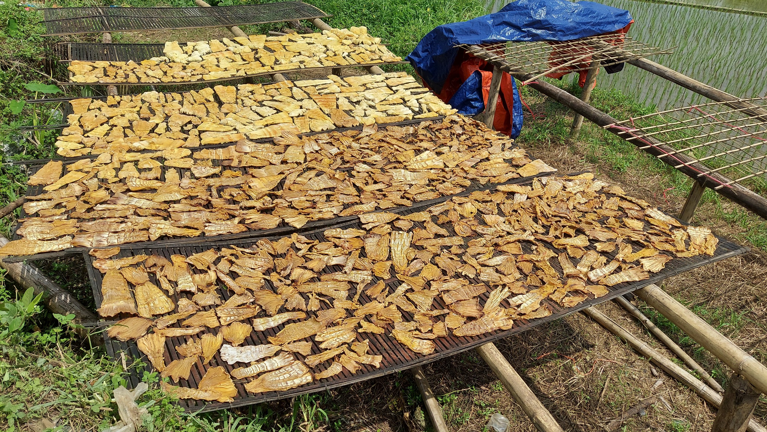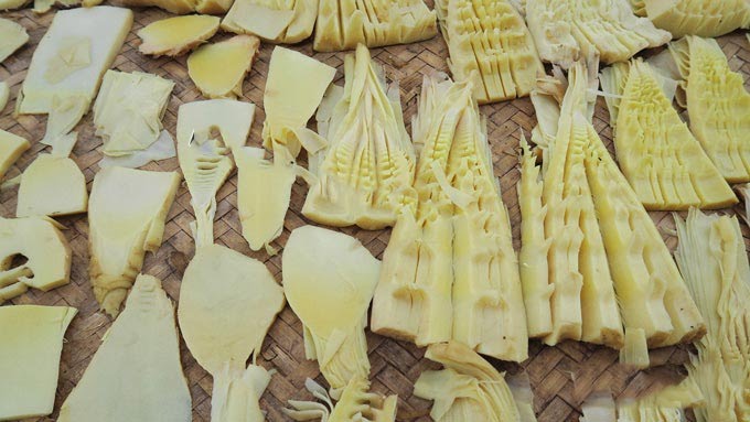 - Phơi măng: Thái măng xong, tiến hành xếp các miếng măng dàn đều lên nia hoặc những miếng cót lớn. Xếp các miếng măng với khoảng cách vừa đủ để măng được khô đều khi phơi. Nếu phơi măng dưới trời nắng to thì từ 5 – 7 ngày, sẽ có được mẻ măng khô. Nếu phơi trong điều kiện nắng nhẹ thì thời gian này cần lâu hơn.