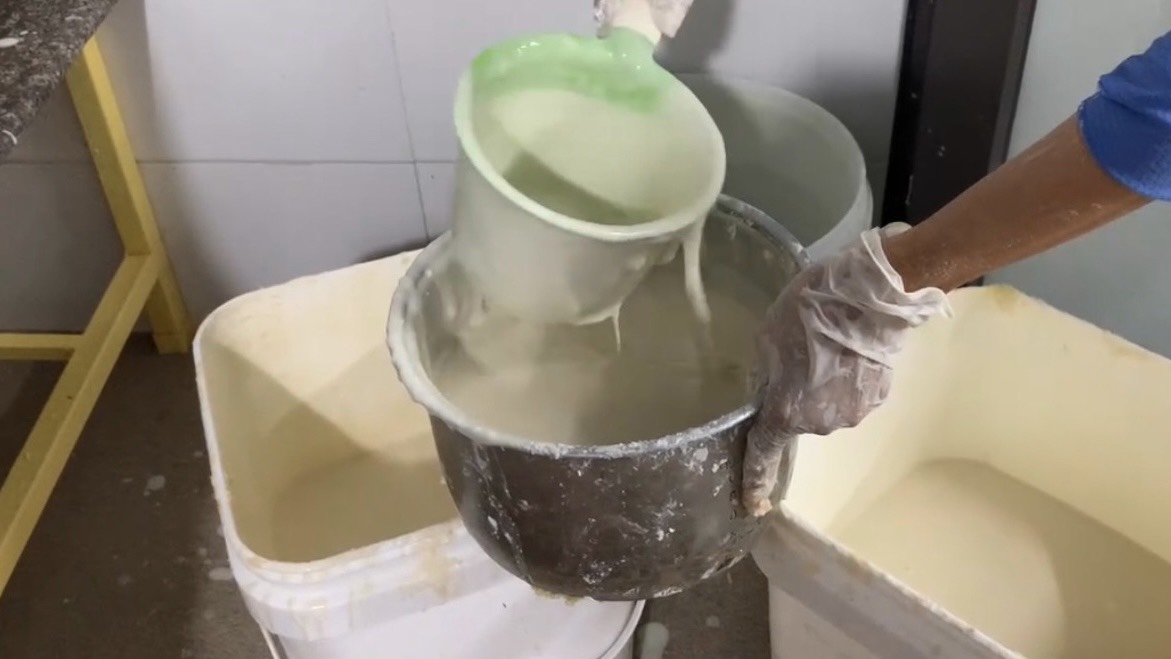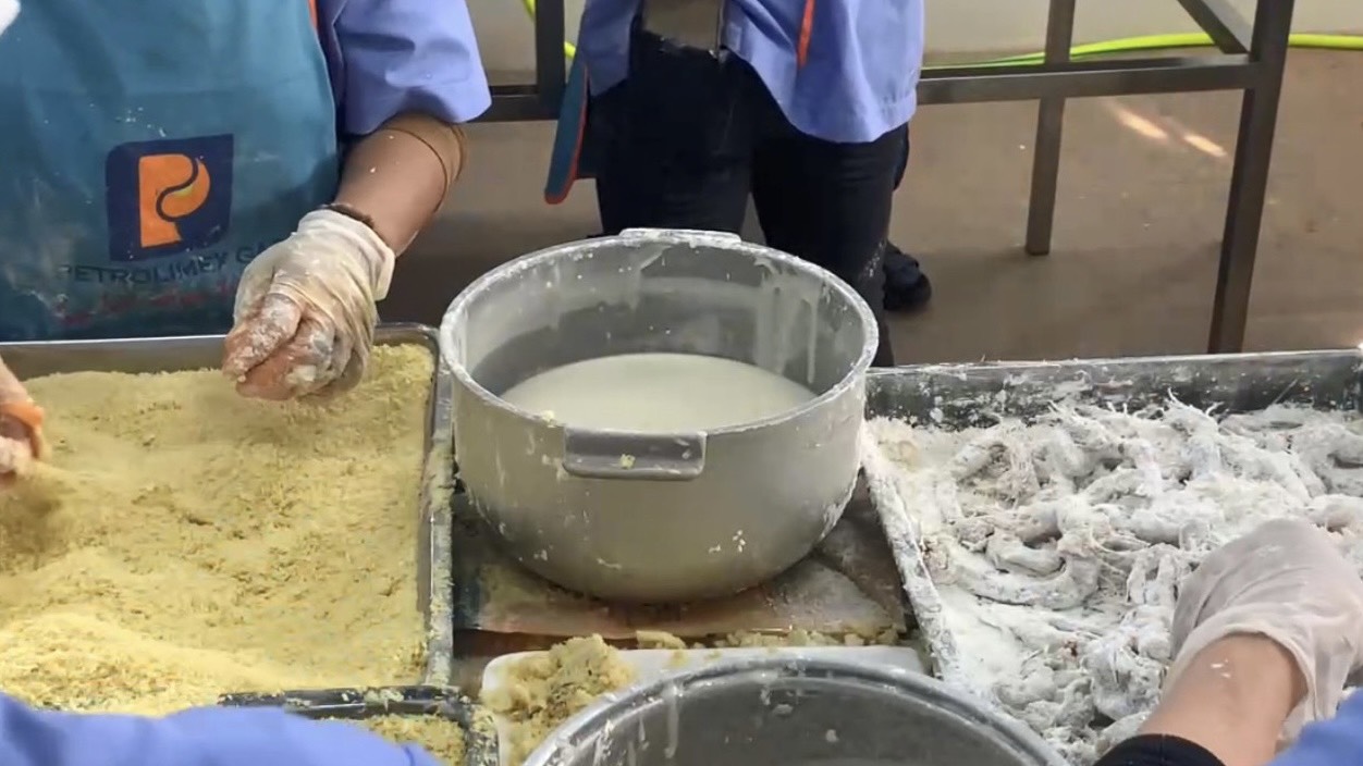 | 4 | Trộn nguyên liệu - Trộn bột ướt để nhúng tôm vào. Bột ướt được pha với nước sạch khuấy đều. |