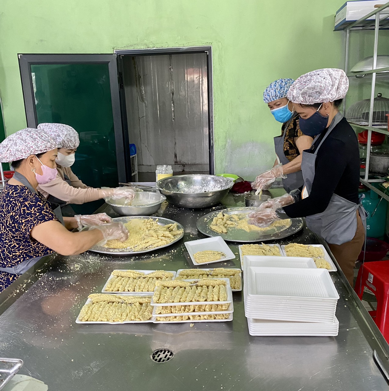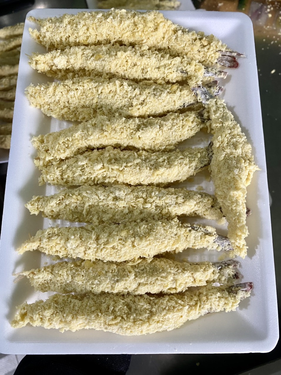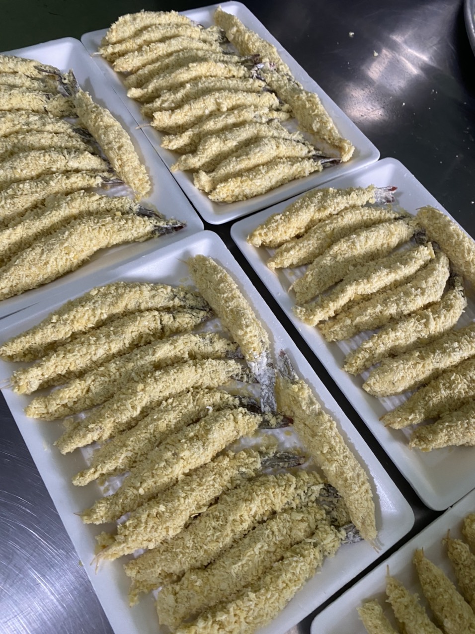 | 7 | Pha, trộn nguyên liệu / thành phần - Sau khi trộn đều bột ướt sẽ nhúng tôm và và vớt ra, tiếp theo nhúng vào bột xù và sắp vào khay |