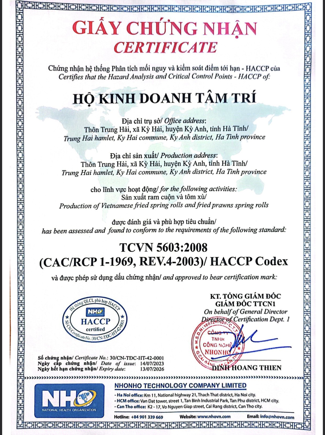 | 1 | Giấy chứng nhận - Cơ sở được cấp giấy chứng nhận đạt tiêu chuẩn Haccp |