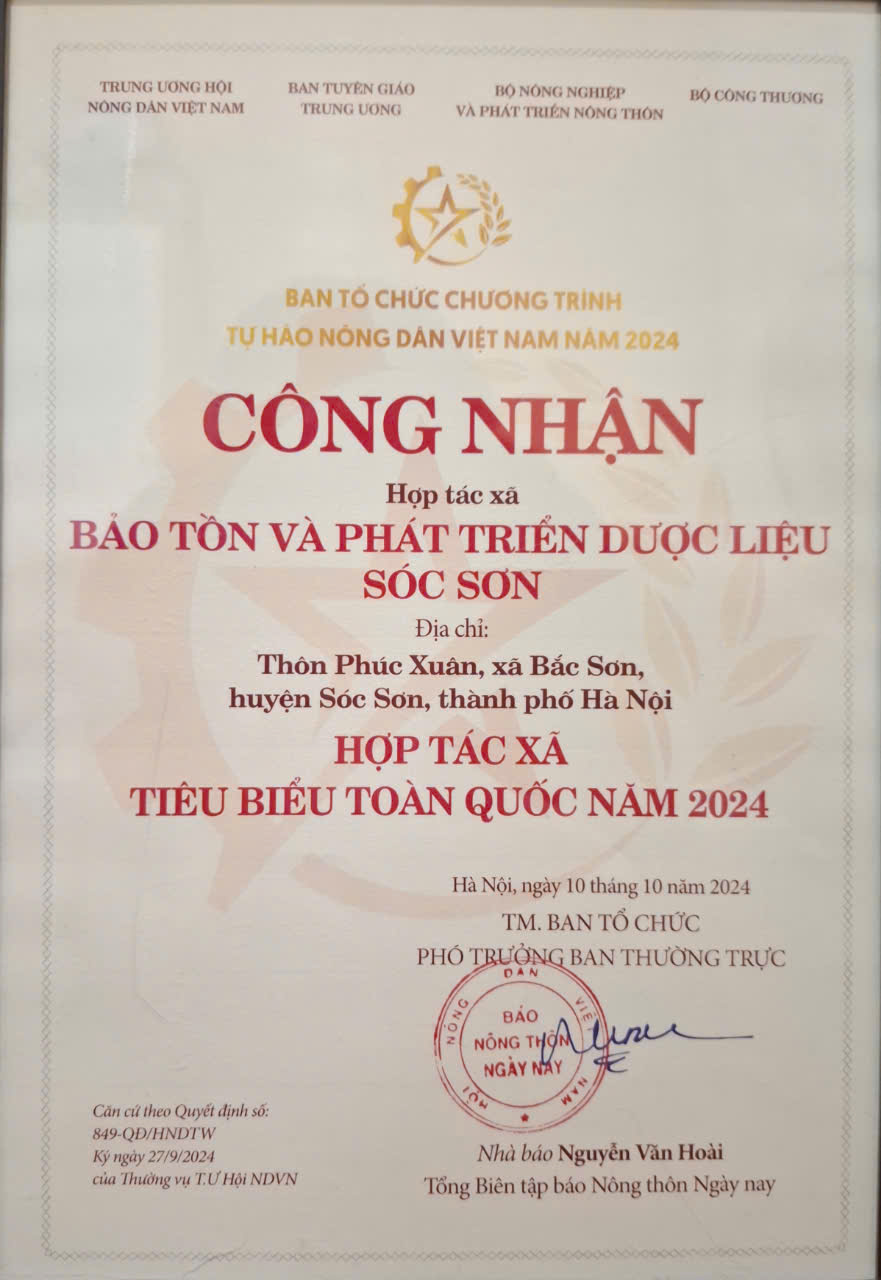 | 2 | Mô tả cơ sở - Các giấy Chứng nhận, bằng khen, của HTX Bảo tồn và Phát triển Dược liệu Sóc Sơn. |