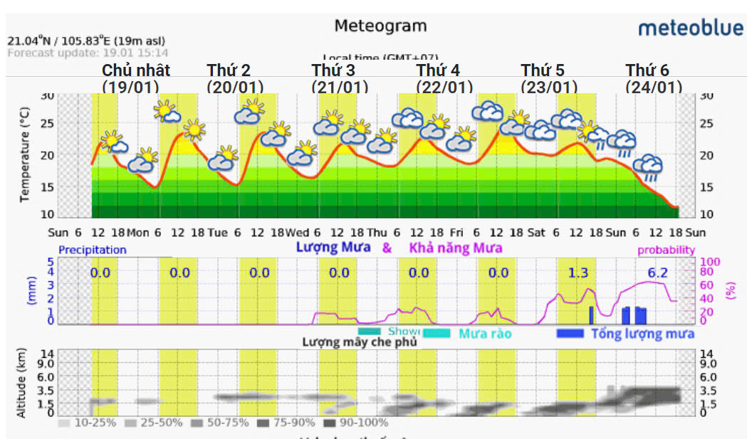| 7 | Tưới nước - Dự báo thời tiết từ 19/01/2025 - 26/01/2025 có khả năng trời trở rét đậm, theo dự báo thời tiết khaorng ngày 26/01, một đợt gió mùa Đông Bắc mạnh ảnh hưởng đến nước ta, do ảnh hưởng của gió mùa Đông Bắc, Hà Nội và các tỉnh miền Bắc từ ngày 26/01 trời rét đậm. Chú ý theo dõi kiểm tra tình hình cây trồng để có biện pháp xử lý kịp thời khi có thiên tai và sâu bệnh hại xuất hiện, đặc biệt là sương muối, sương giá. |