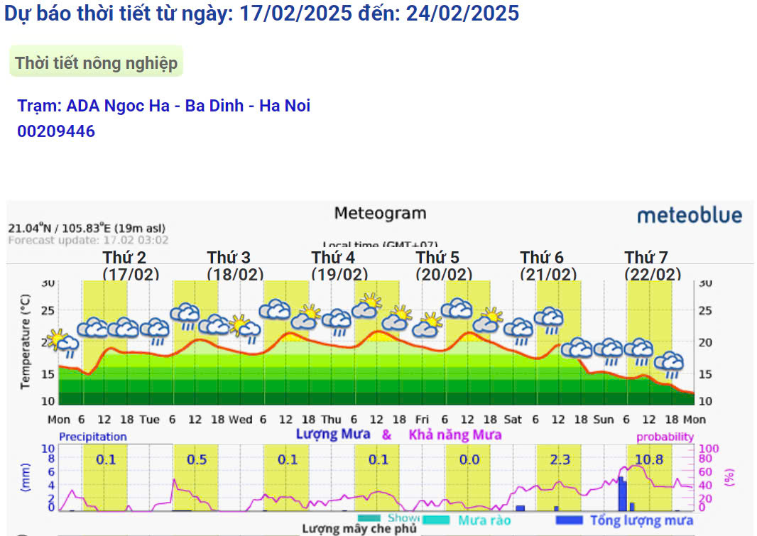 | 9 | Thao tác kỹ thuật - Dự báo thời tiết từ 2/3/2025 - 9/3/2025. Hà Nội vẫn tiếp tục mưa, nồm ẩm. Trong đó, xuất hiện hai đợt không khí lạnh sắp tràn về nước ta, đợt ngày 6/3 cường độ mạnh gây mưa rét ở Bắc Bộ và Bắc Trung Bộ, vùng núi có nơi giảm còn 10 độ C. Cụ thể, Xã hội Tuần tới miền Bắc đón 2 đợt không khí lạnh, nhiệt độ thấp nhất 10 độ C Chủ nhật, 2/3/2025 06:56 (GMT+7)Hai đợt không khí lạnh sắp tràn về nước ta, trong đó đợt ngày 6/3 cường độ mạnh gây mưa rét ở Bắc Bộ và Bắc Trung Bộ, vùng núi có nơi giảm còn 10 độ C. Từ nay đến 6/3, thời tiết miền Bắc có nhiều biến động, chuyển từ trạng thái nắng ấm, có nơi nắng nóng sang mưa rét. Cụ thể, khoảng 4-5/3, không khí lạnh khả năng tăng cường trở lại miền Bắc và được tăng cường mạnh hơn vào ngày 6/3, miền Bắc giảm nhiệt rõ rệt, trời chuyển rét, vùng núi có nơi rét đậm, rét hại. Bắc Trung Bộ cũng chuyển rét từ đêm 6/3. Tại Hà Nội, các ngày 7-9/3, nhiệt độ thấp nhất dao động 15-16 độ C, cao nhất 18-19 độ C, biên độ nhiệt ngày và đêm thấp, trời rét. Trong đó, Tại Hà Nội, các ngày 7-9/3, nhiệt độ thấp nhất dao động 15-16 độ C, cao nhất 18-19 độ C, biên độ nhiệt ngày và đêm thấp, trời rét. Trong đó, tại Hà Nội các ngày 7-9/3, nhiệt độ thấp nhất giao động 15 - 16 độ, cao nhất 18 - 19 độ C. Biên độ nhiệt ngày đêm thấp, trời rét. Trong đó, ngày 6-7/3 có mưa, mưa rào. Do vậy, cần chủ động trong việc tưới tiêu và thăm nom đồng ruộng, phòng trừ sâu bệnh hại có thể xảy ra. |