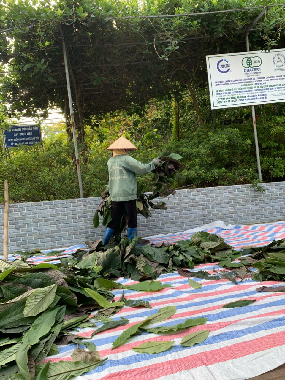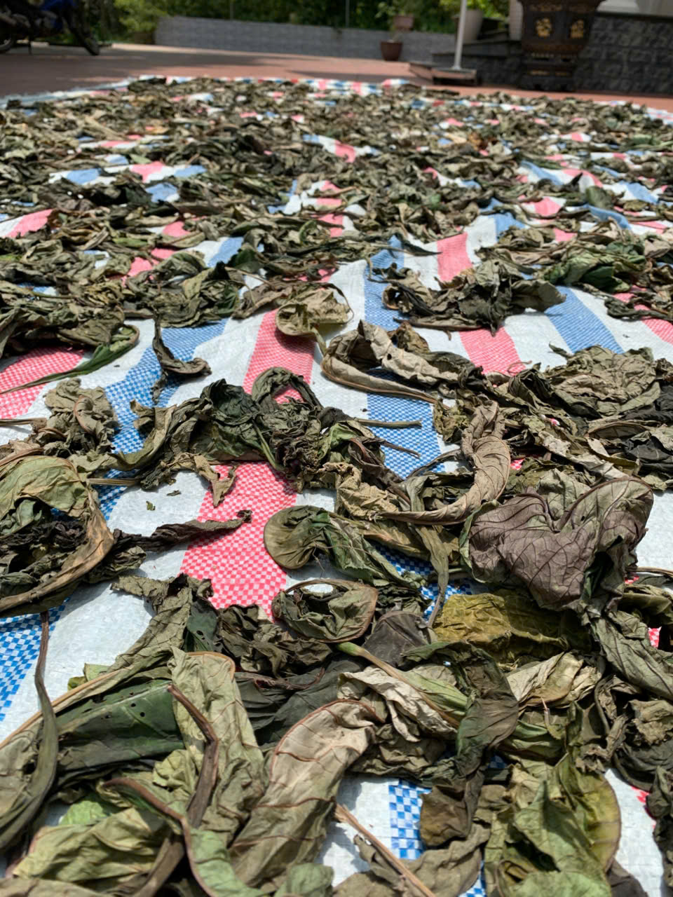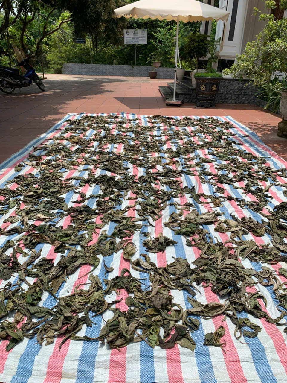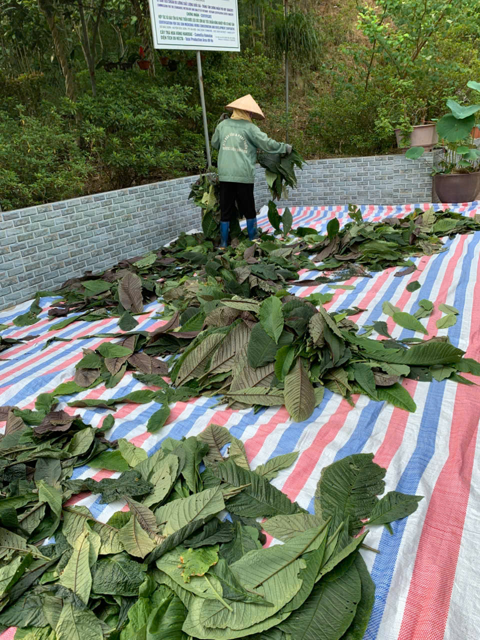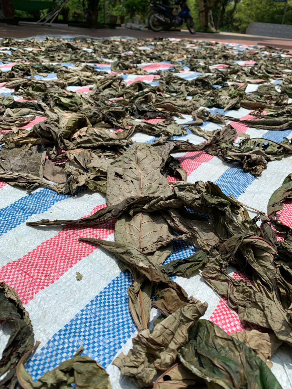 | 13 | Phơi sấy thủ công - Tiến hành phơi sấy thủ công, lá khôi sau khi được thu hái về đem trên bạt dứa và phơi trực tiếp dưới nắng mặt trời. Khu phơi sấy tách biệt với khu chăn nuôi để tránh có sự ra vào của động vật. Hình ảnh lá khôi sau khi phơi thủ công 1 ngày. |