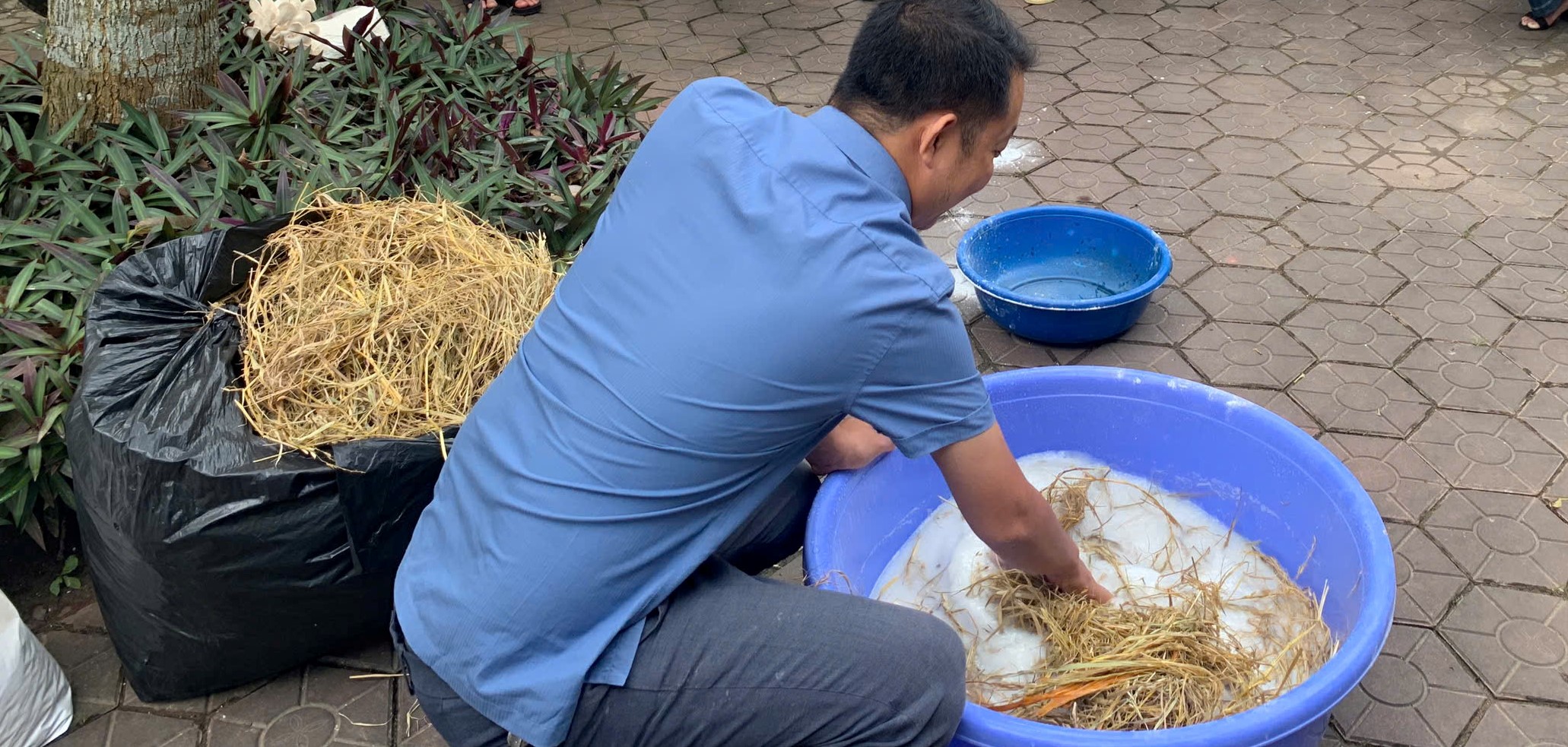 - Cho rơm vào nước vôi ngâm, sau 15-20p khi đã ngấm đều tiến hành vớt rơm ra và xếp thành đống để ủ.