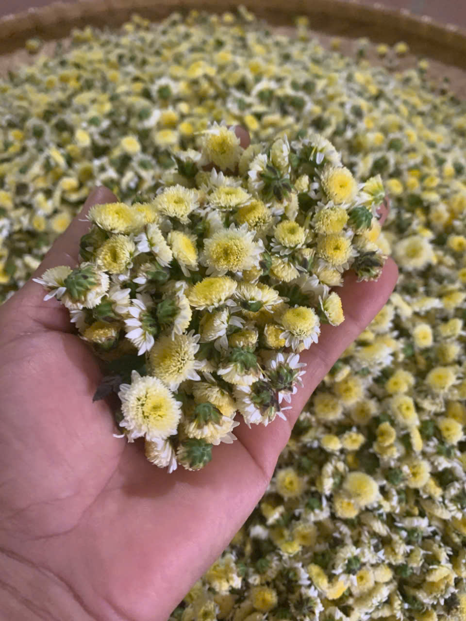 - Tiếp tục chọn thời điểm khô ráo để thu hoạch hoa cúc. Tổng khối lượng lần thu thứ 2 được 9kg hoa tươi. Sau khi sấy thu được 1.2kg hoa khô.