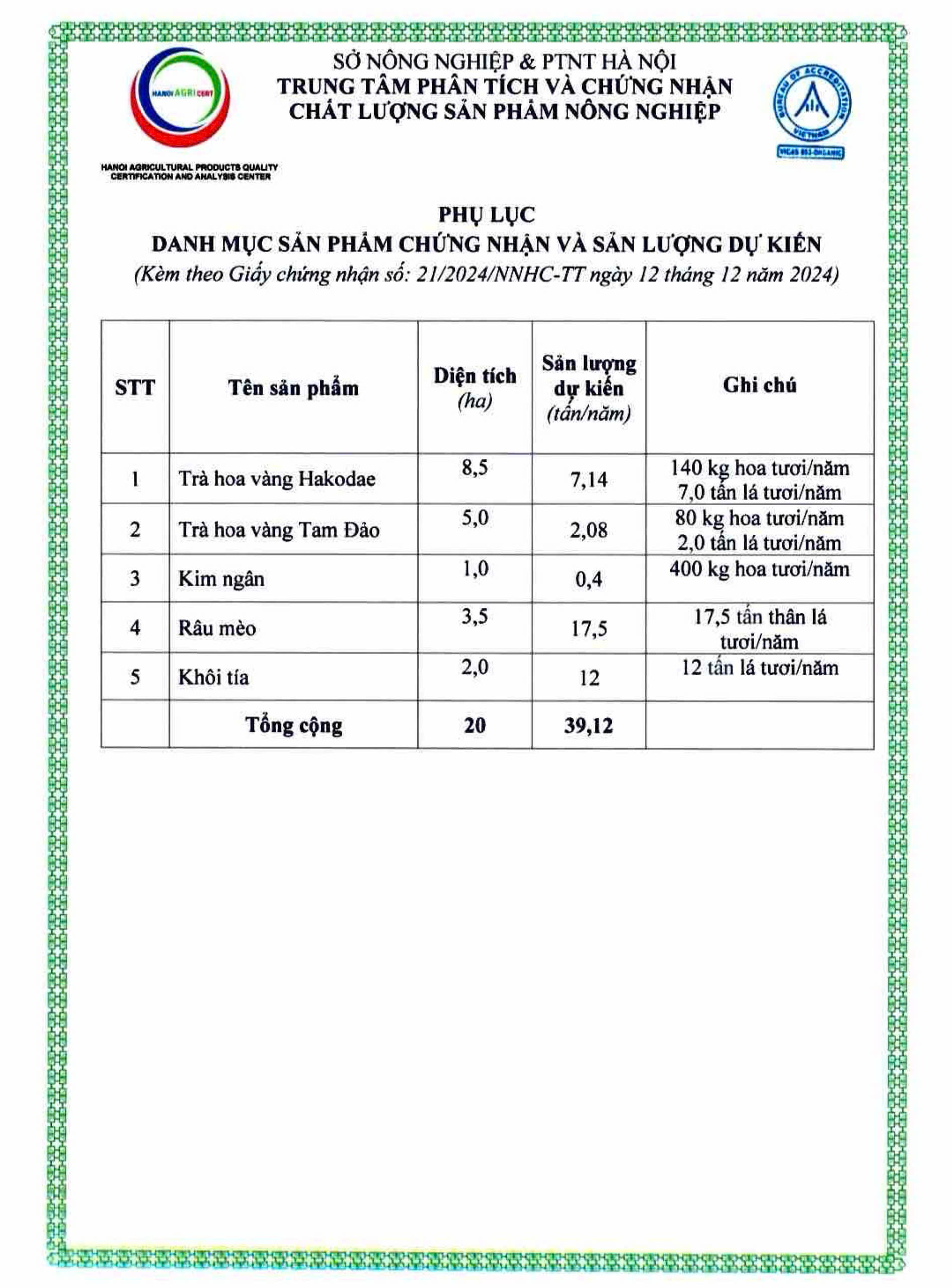 | 2 | Mô tả cơ sở - HTX Bảo tồn và Phát triển Dược liệu Sóc Sơn đạt chứng nhận "Sản phẩm phù hợp tiêu chuẩn Việt Nam về nông nghiệp hữu cơ" của Sở Nông nghiệp & PTNT Hà Nội, trong đó có sản phẩm trà hoa vàng. Hiện tại khu 3 trồng Trà hoa vàng đang trong giai đoạn chuyển đổi Hữu cơ Nhật Bản, dự kiến cuối năm 2025 sẽ được cấp giấy chứng nhận. |