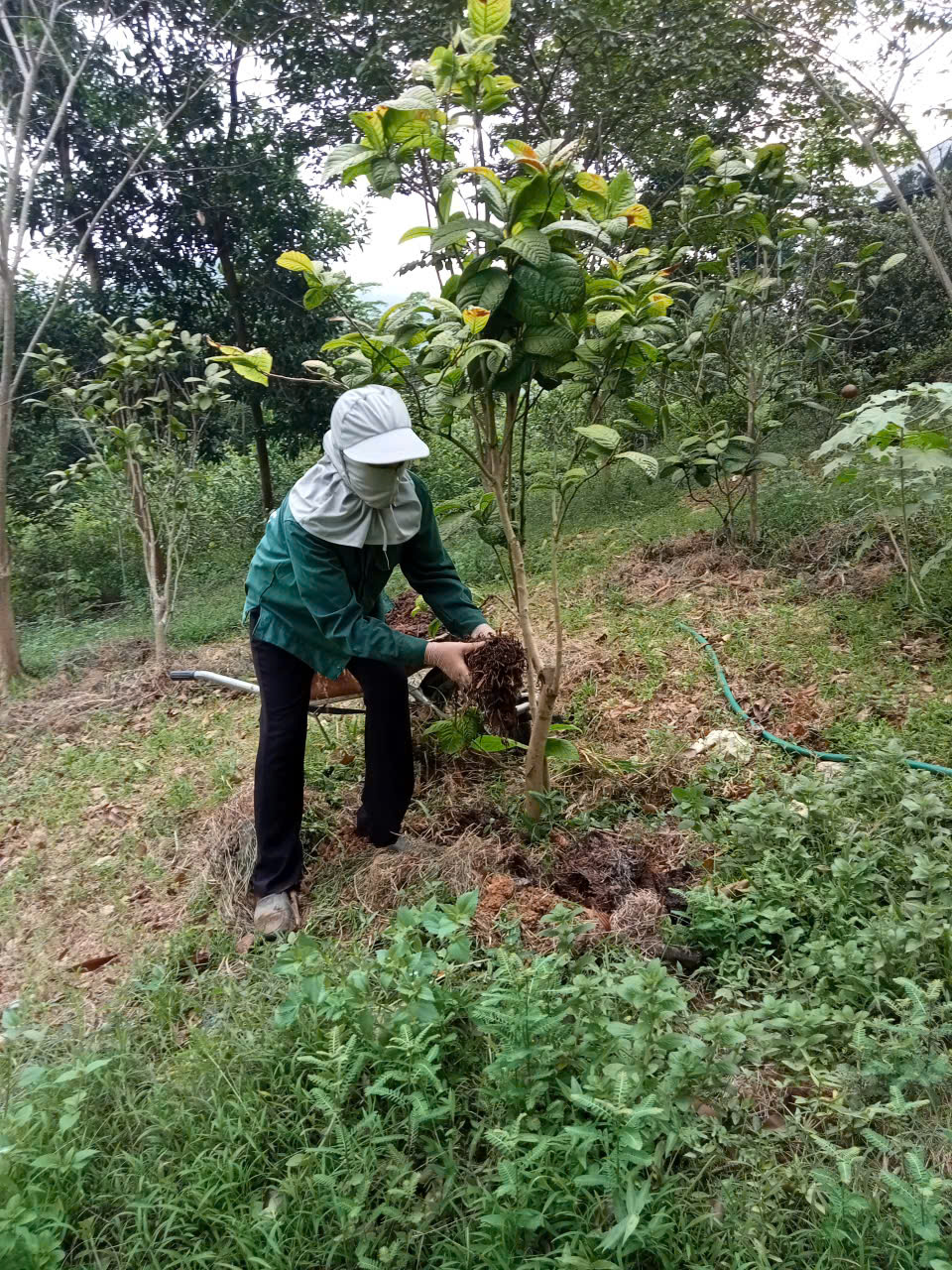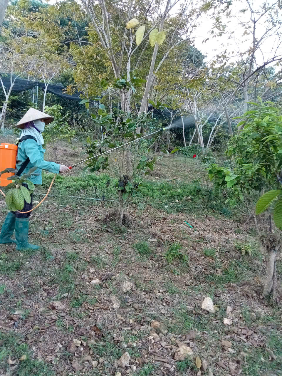 | 16 | Phòng trừ bệnh - Tiến hành phun chế phẩm sinh học trừ sâu thảo mộc kết hợp Anisaf 01, 02 và 03. Cách dùng: pha tỉ lệ 80ml mỗi loại chế phẩm pha chung với bình 20 lít nước, tiến hành pha và phun cho toàn bộ vườn. Tổng 6 bình phun. |