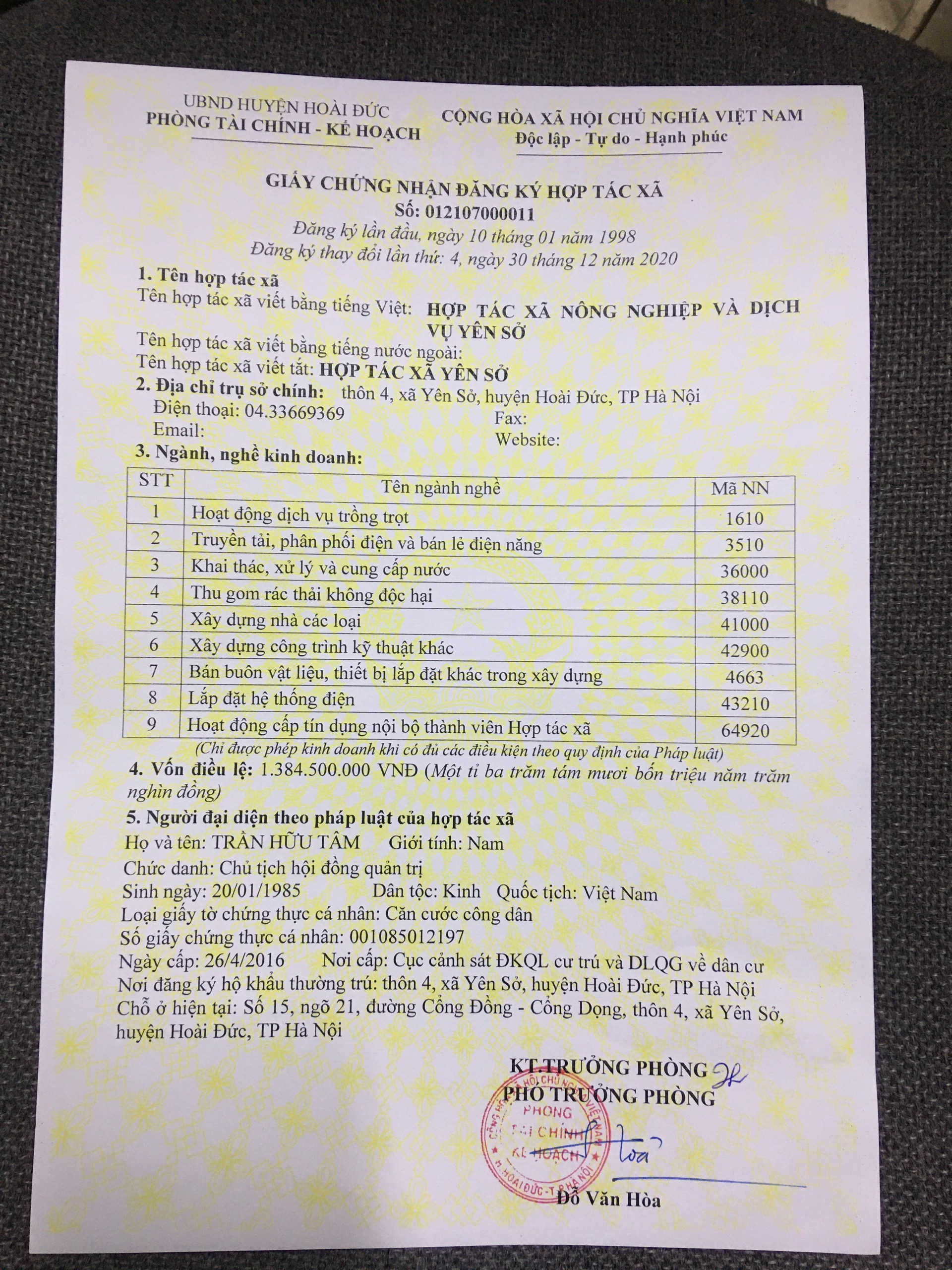 Cơ quan : Thôn 4, xã Yên Sở, huyện Hoài Đức, thành phố Hà Nội