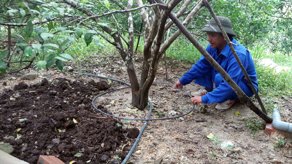 | 18-03-2023 12:03:00 | Bón Thúc | - Để vườn bưởi được nhanh chóng phục hồi và cho năng suất cao trong vụ mùa tiếp theo, cần phải biết bón phân một cách hợp lý. Bón phân chuồng trước, sau đó bón phân vô cơ. Phân chuồng phải được ủ với chế phẩm Hatimic trước khi sử dụng ít nhất 1-2 tháng. Do trong phân chuồng có rất nhiều vi sinh vật, những vi sinh vật này hoạt động biến urê thành dạng đạm dễ tiêu, lân khó tiêu thành lân dễ tiêu. Khi các vi sinh vật đã có trong đất, tiếp tục bón phân vô cơ. Nếu đất vườn bị chua cần bón vôi trước khi bón phân 15-20 ngày. Lượng phân bón cho 1 gốc cây như sau: 20-30 kg phân chuồng hoai + 2 - 7kg phân vi sinh + 0,15-0,3 kg Urê + 0,9-2,2kg super lân + 0,15-0,4 kg Kali, tùy theo năm tuổi (thường áp dụng cam 4-10 năm kể từ khi cho thu hoạch). Ngoài ra có thể dùng phân NPK chuyên dùng để bón cho bưởi. - Trước khi bón phân, sử dụng cuốc đào rãnh theo hình chiếu tán của cây, sâu 20-25 cm, rộng 20-25 cm (tuỳ lượng phân bón), phơi đất khoảng 3-7 ngày tùy vào thời tiết, sau đó trộn đều các loại phân bón với đất phơi ải, bón vào rãnh rồi lấp đất ngay, không bón phân trực tiếp vào rễ cây. Việc đào rãnh bón phân có tác dụng làm đứt hệ rễ tơ cũ, tạo hệ rễ tơ mới, cây hấp thụ các chất dinh dưỡng tốt hơn. | Hoàn thành | |
