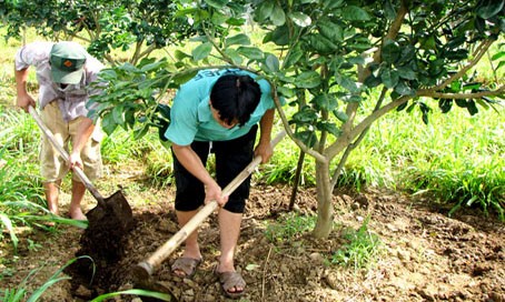 | 12-03-2023 12:03:00 | Làm cỏ | - Việc làm cỏ, dọn vệ sinh trong vườn sau khi thu hoạch là hết sức cần thiết, để tránh cư trú cho các loài sâu bệnh xâm nhập, gây ảnh hưởng đến chất lượng và năng suất vườn bưởi. - Làm cỏ theo hình chiếu tán của cây khoảng 1-1,2m kể từ gốc, kết hợp thu dọn quả rụng và các tàn dư cành lá khô có trong vườn bưởi trước khi bón phân. Những dãy cỏ mọc ngoài tán cây hoặc trên đường băng có thể để nguyên, nhưng nếu cỏ phát triển quá tốt thì cần có biện pháp xử lý như cắt bỏ bớt để tránh tình trạng cạnh tranh dinh dưỡng với cây bưởi, đồng thời giữ được độ ẩm cho vườn. - Cần lưu ý, trong giai đoạn này không được sử dụng thuốc trừ cỏ để phun vào vườn bưởi. Bởi trong giai đoạn sau thu hoạch bộ rễ của cây cam rất yếu và bộ rễ tơ của cây đang phát triển, nếu bị ảnh hưởng bởi thuốc hóa học bộ rẽ tơ sẽ bị thối hỏng, ảnh hưởng đến sự hấp thụ dinh dưỡng của cây. - Việc xới đất cho cây bưởi cần được thực hiện hàng năm, để tạo độ thông thoáng và cung cấp thêm oxy cho đất. Khi xới đất cần chú ý ở gần gốc thì xới nông, giữa các hàng thì xới sâu hơn do rễ của bưởi mọc yếu và nông gần lớp đất mặt. | Hoàn thành | |