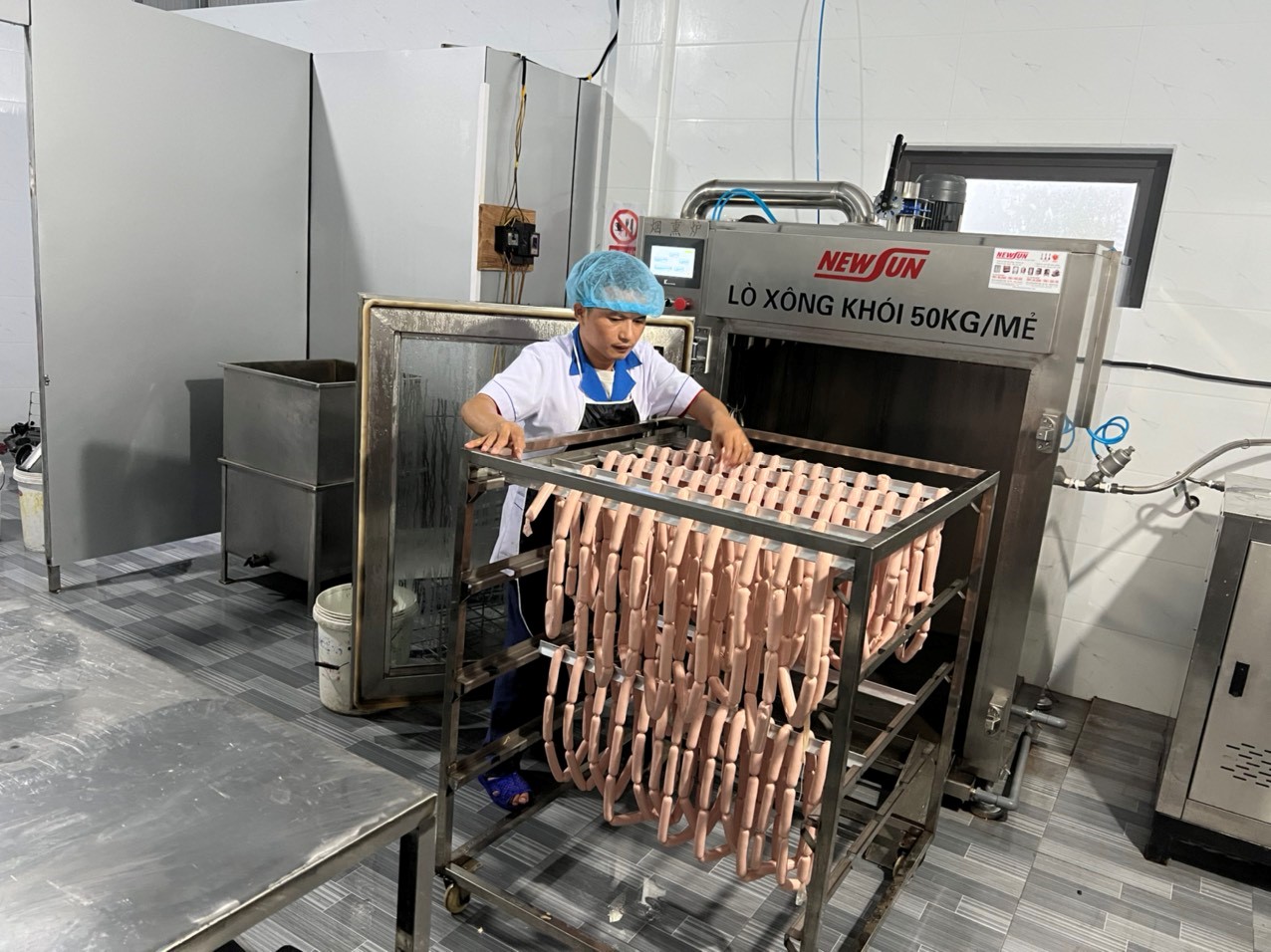 30-10-2023 12:10:00 Hấp chín, xông khói B9. Đảm bảo xúc xích chín đều, có màu sắc ổn định, không bị nứt vỏ. Xúc xích có mùi hương gồ xồi tự nhiên. Hấp chín, xông khói Xúc xích sau khi buộc chỉ được đưa vào từng khay inox để sắp xếp. Các khay không được để quá nhiều, xúc xích phải được sắp xếp sao cho hơi có thể chín đều trên toàn bộ khay. Nhiệt độ ban đầu là hấp ở 85 °C trong thời gian 5 phút. - Sau đó hấp ở nhiệt độ 80 °C trong thời gian 20 phút. Kiểm tra định kỳ mẻ hấp trong quá trình hấp. Dùng máy hấp để hấp, kiểm tra nhiệt độ của tủ hấp thường xuyên. Sau khi hoàn thành công việc tủ được lau chùi và sát trùng kỹ càng. Hoàn thành