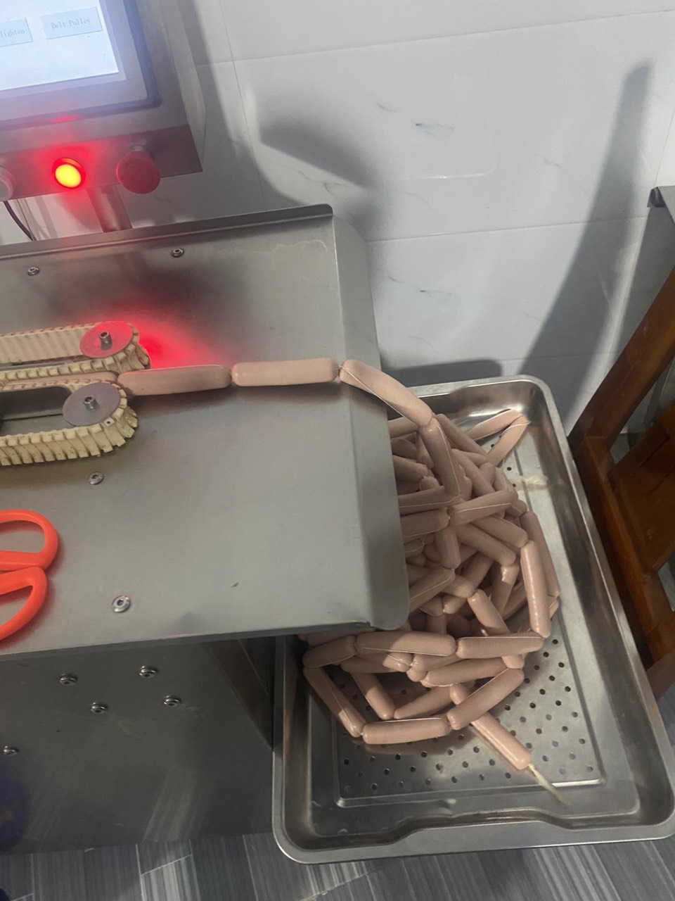 30-10-2023 12:10:00 Buộc chỉ định lượng B8. Buộc chỉ định lượng Các mẻ đùn được đưa vào hệ thống máy buộc chỉ định lượng bán thủ công, kích cỡ xúc xích được điều chỉnh cố định từ đầu theo ý muốn. Sau khi đùn phải đưa vào bảo quản tủ mát từ 2-4 °C. Dùng máy chuyên dụng để đùn xúc xích, sau khi hoàn thành công việc máy được lau chùi và sát trùng kỹ càng. Hoàn thành