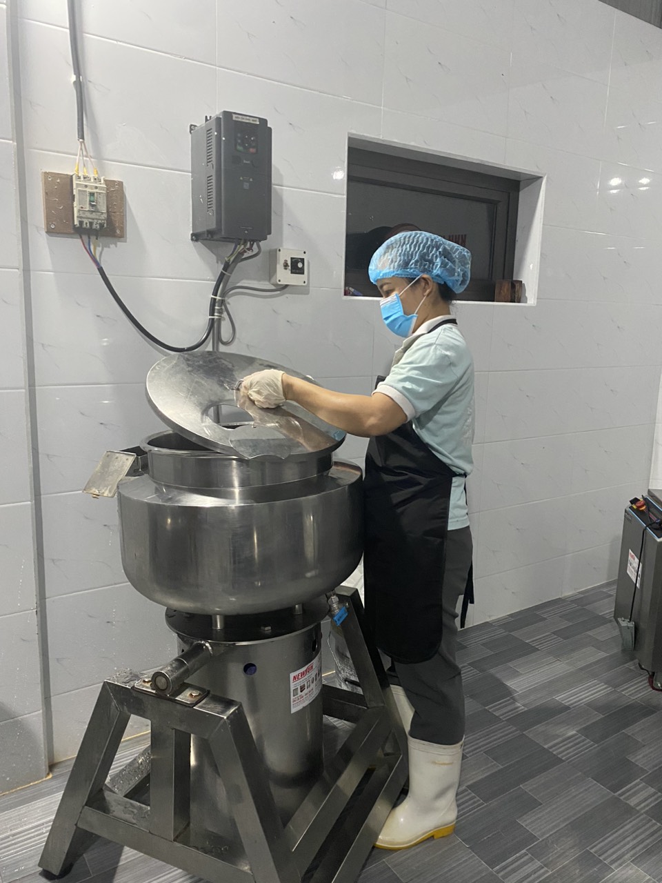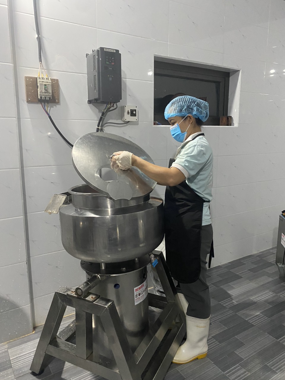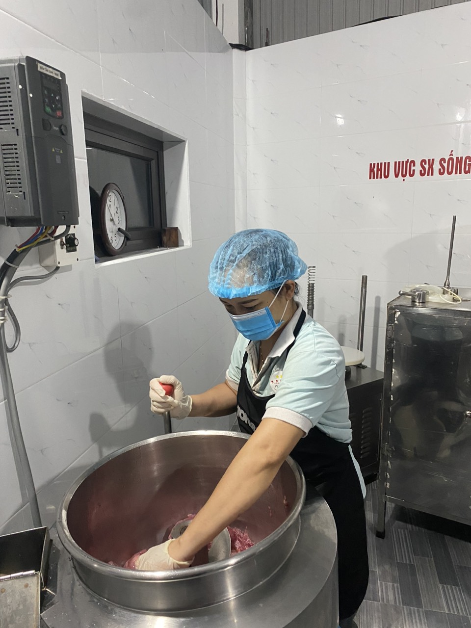 30-10-2023 12:10:00 Xay tinh B6. Nguyên liệu sau khi xay thô tiếp tục được xay tinh nhằm đảm bảo độ dẻo của thịt. Xay tinh tất cả nguyên liệu sau khi xay thô được đưa vào cối trộn. Trước khi xay tinh phải đảm bảo cối trộn được làm lạnh đến nhiệt độ cần thiết. Quá trình xay phải đảm bảo về thời gian, tốc độ vòng xoay của máy để mẻ trộn được đảm bảo độ dẻo, không quá khô, không quá ướt và các loại phụ gia và hương liệu được trộn đều. Dùng dụng cụ chuyên dung để trộn , không để nguyên liệu rơi bắn ra ngoài. Hoàn thành