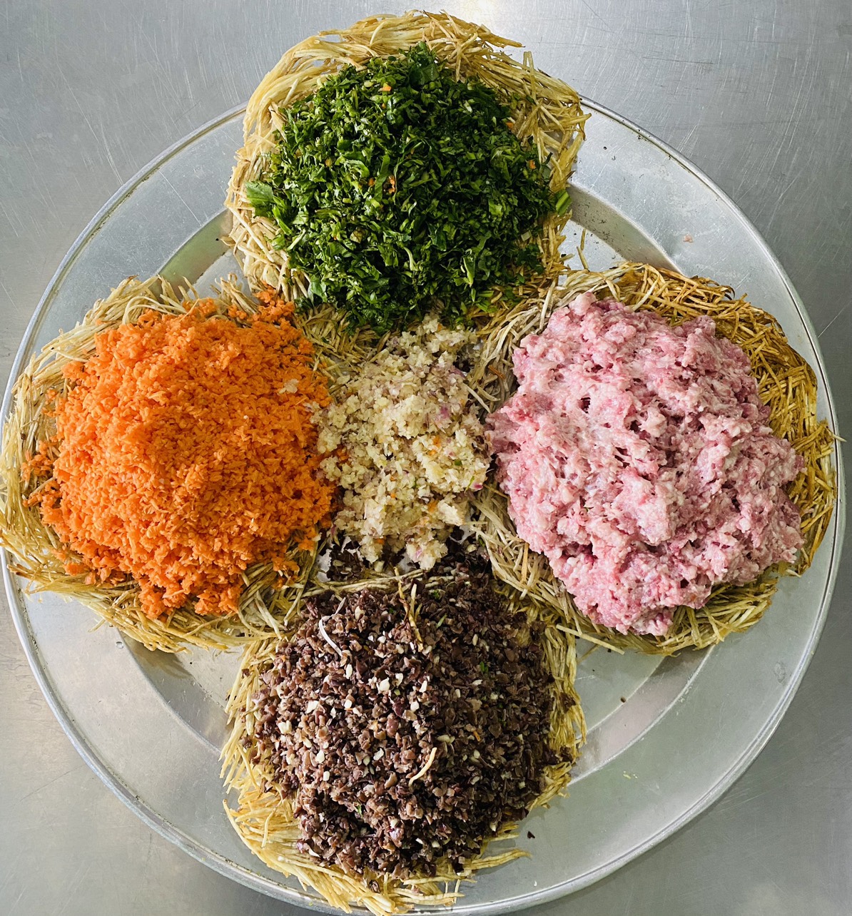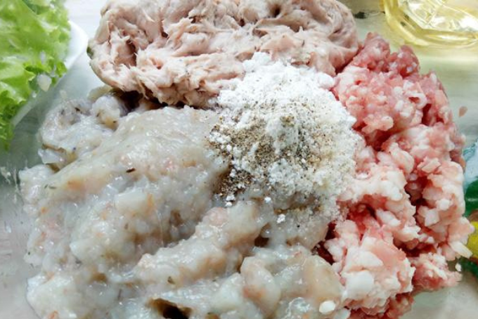 09-07-2024 12:07:00 Chế biến nguyên liệu Thịt và tôm sau khi sơ chế sẽ được trộn với gia vị để tiến hành cuộn ram Hoàn thành