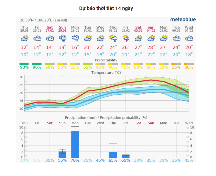 25-01-2024 12:01:00 Cơ sở ao nuôi, vùng nuôi trồng Theo dự báo của trạm thời tiết iMetos đặt tại Hưng Hà dự báo cho Vùng Thái Bình tham khảo dự báo thời tiết cho 7 đến 14 ngày tới Hoàn thành