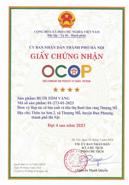 | 01-01-2024 12:01:00 | Chứng chận tiêu chuẩn | Giấy chứng nhận tiêu chuẩn Vetgap cho bưởi tôm vàng Thượng Mỗ | Hoàn thành | |