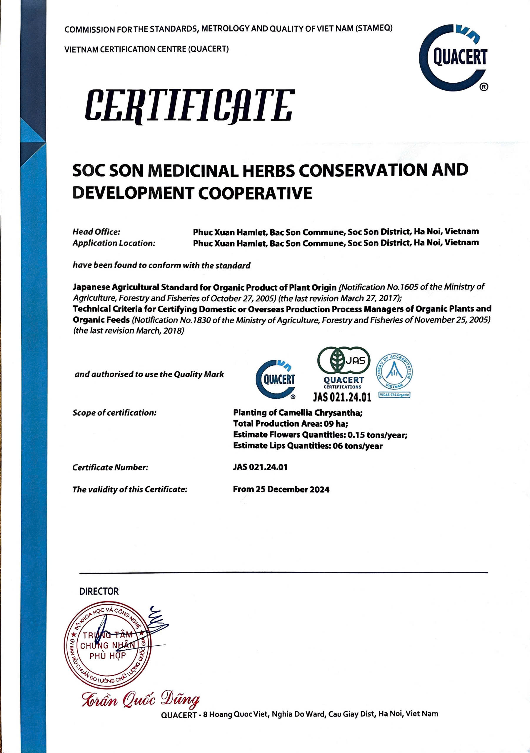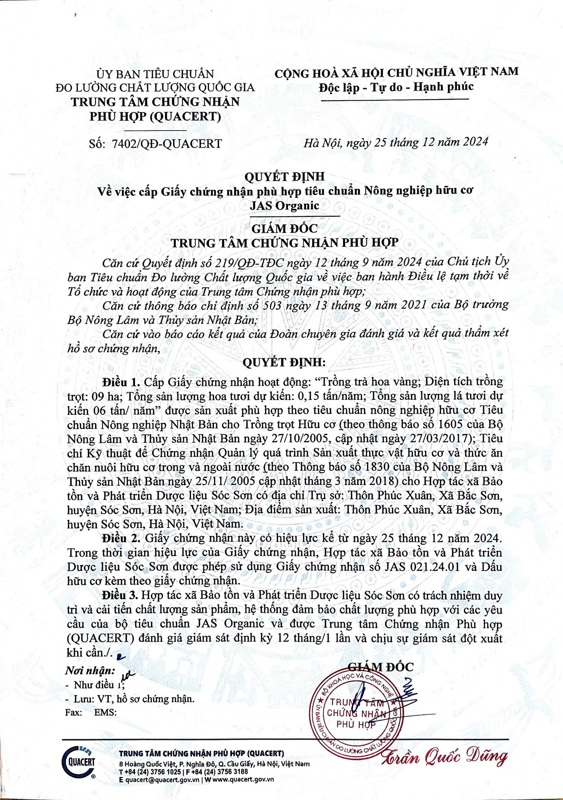 | 16-07-2025 12:07:00 | Mô tả cơ sở | Vùng trồng Trà hoa vàng đạt chứng nhật Tiêu chuẩn Nông nghiệp Nhật Bản cho Trồng trọt hữu cơ (JAS) theo số giấy chứng nhận JAS 021.24.01, có hiệu lực từ ngày 25/12/2024. | Hoàn thành | |