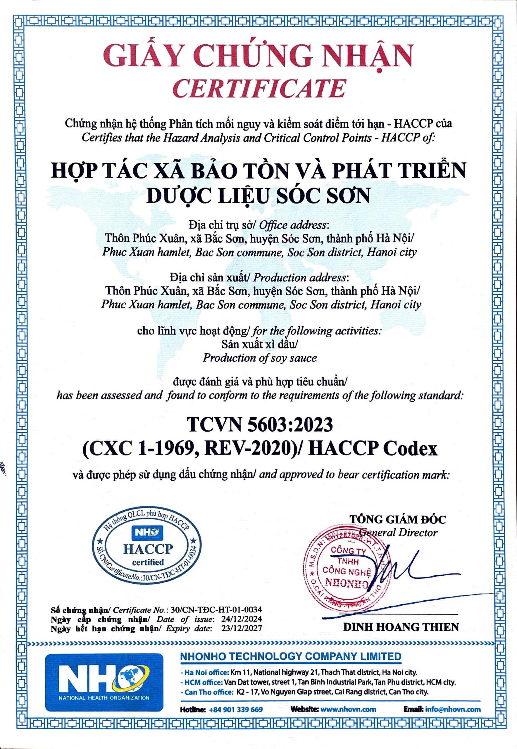 | 01-07-2025 12:07:00 | Giấy chứng nhận | Sản phẩm Xì dầu 2S Đỗ đen - Ngưu bàng đạt Chứng nhận HACCP - Hệ thống phân tích mối nguy và kiểm soát điểm tới hạn. Chứng nhận Sản phẩm có nguồn gốc Thiên nhiên, Chứng nhận ATVSTP. | Hoàn thành | |
