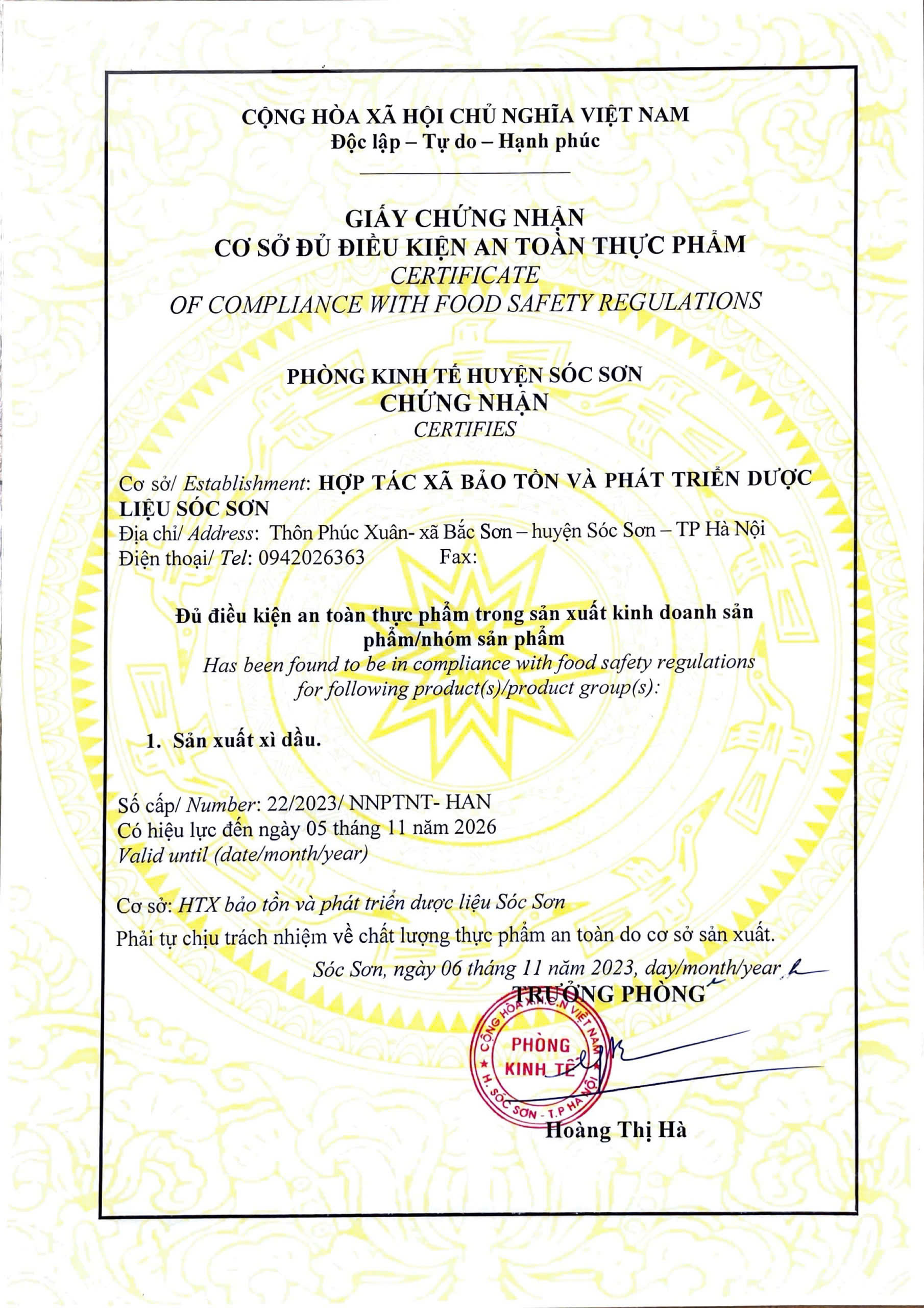 | 01-07-2025 12:07:00 | Kiểm tra chất lượng nguyên liệu đầu vào | Một số thành phần chính có trong nước Xì dầu được sản xuất tại HTX Bảo tồn và phát triển Dược liệu Sóc Sơn đã được nghiên cứu bài bản. | Hoàn thành | |