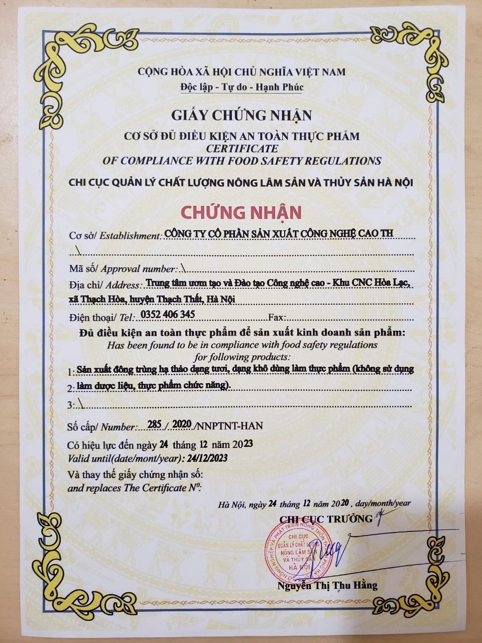 | Chứng chỉ | 285/2020/NNPTNT-HAN |