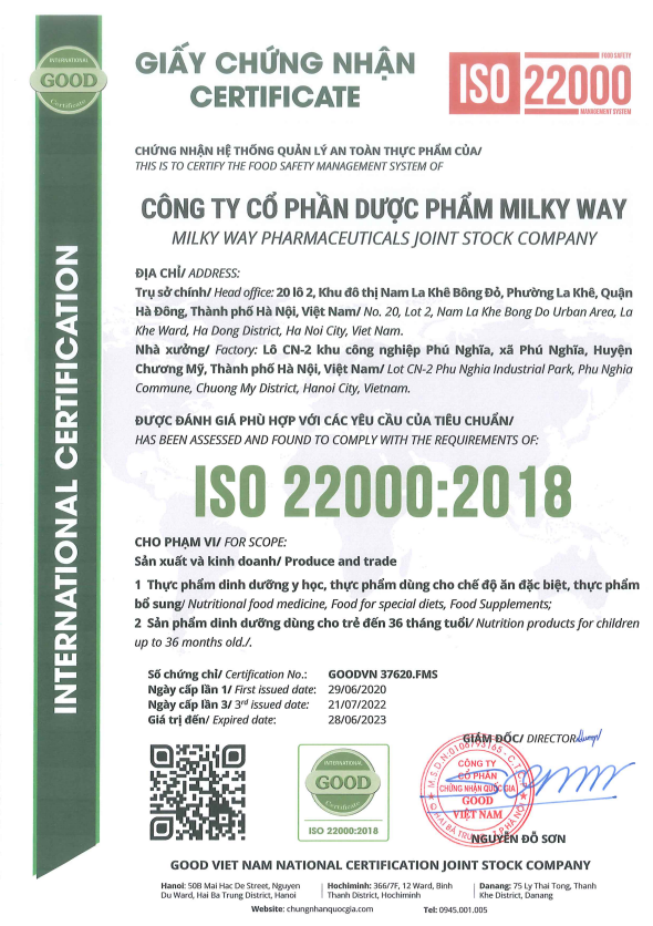 - Giấy chứng nhận Global GMP, ISO 22 000:2018