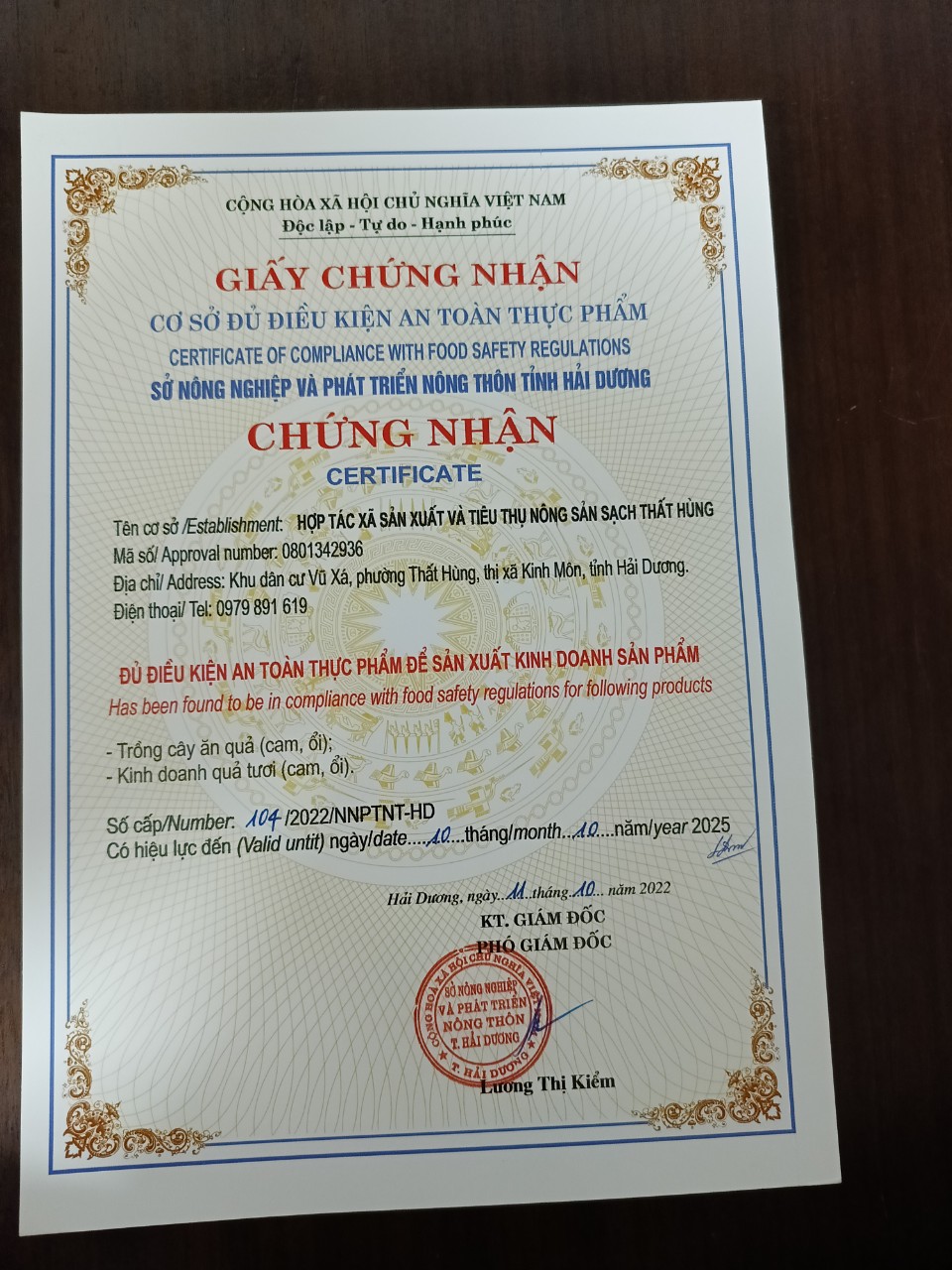 | Cơ sở sản xuất | HTX sản xuất và tiêu thụ nông sản sạch Thất Hùng |
